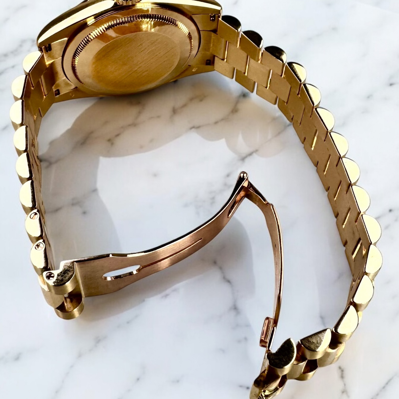 Its water-resistant feature adds to the overall practicality of the Day-Date model and enchases its versatility. Whether you're at a formal event or sporting it as a daily wear, this Rolex timepiece is designed to make a statement.