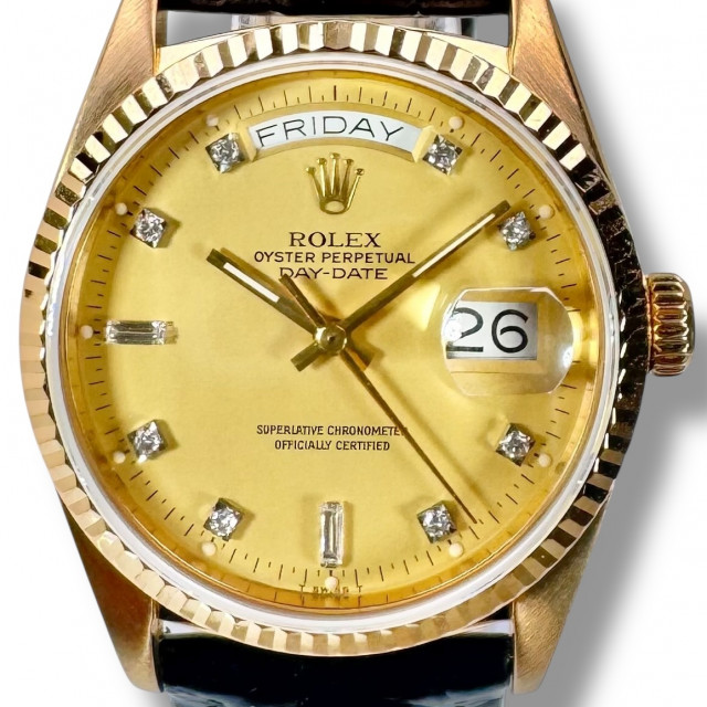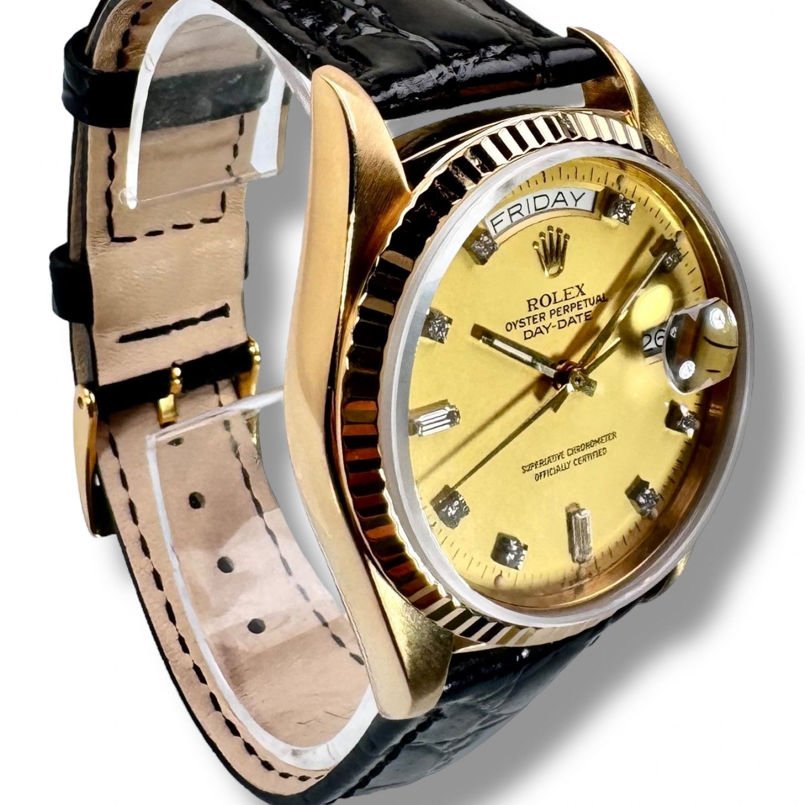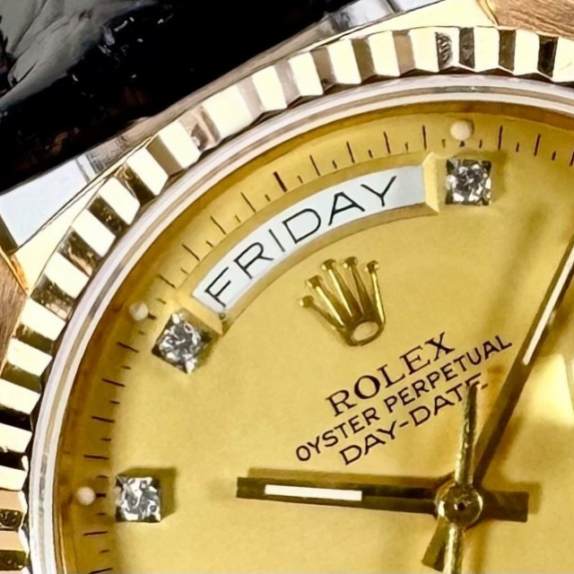 Honouring its origins, this Day Date model is adorned with the signature Champagne Dial. The dial radiates a warm, glowing sheen that beautifully complements the solid gold casing. The gold hands, harmoniously synchronized with the aesthetic, ensure a perfect balance between opulence and elegance.
