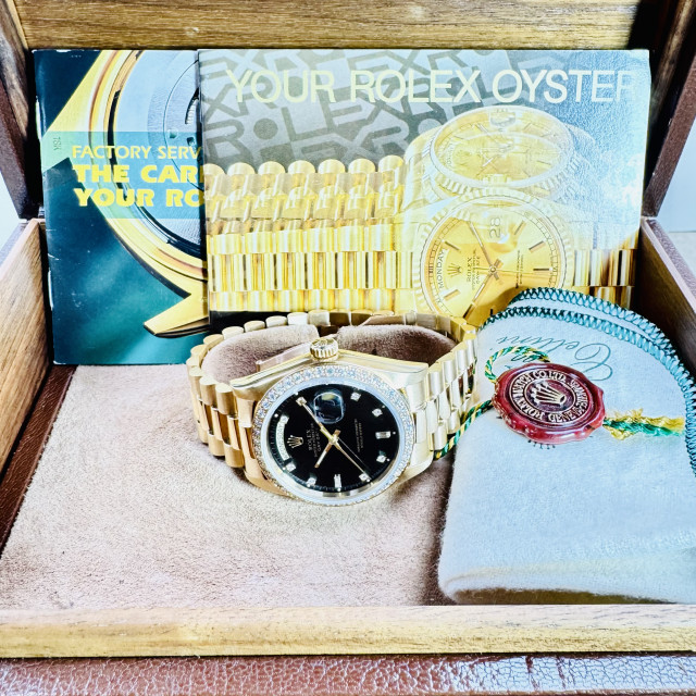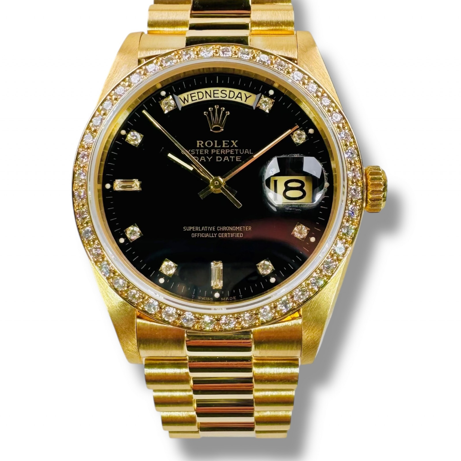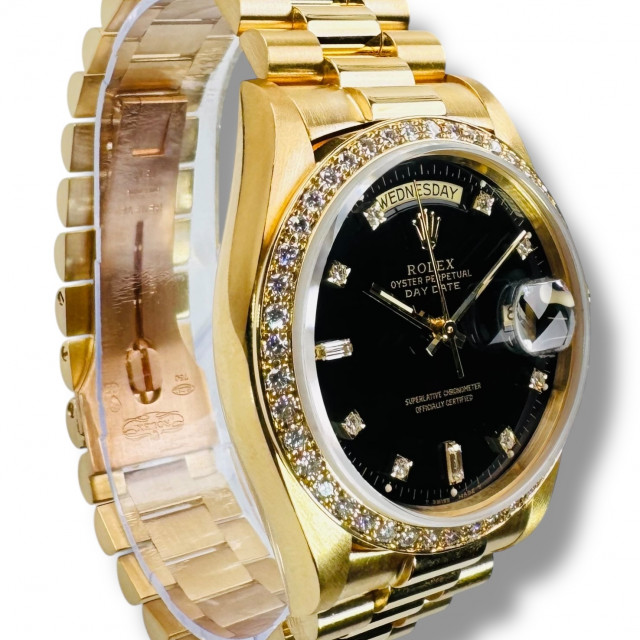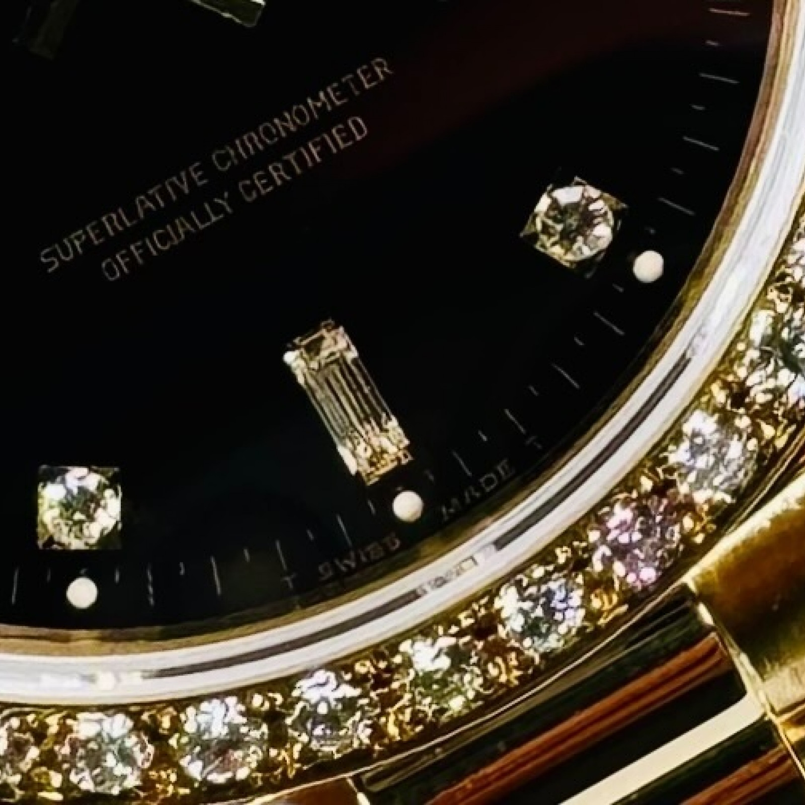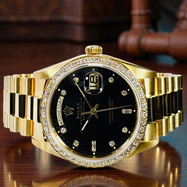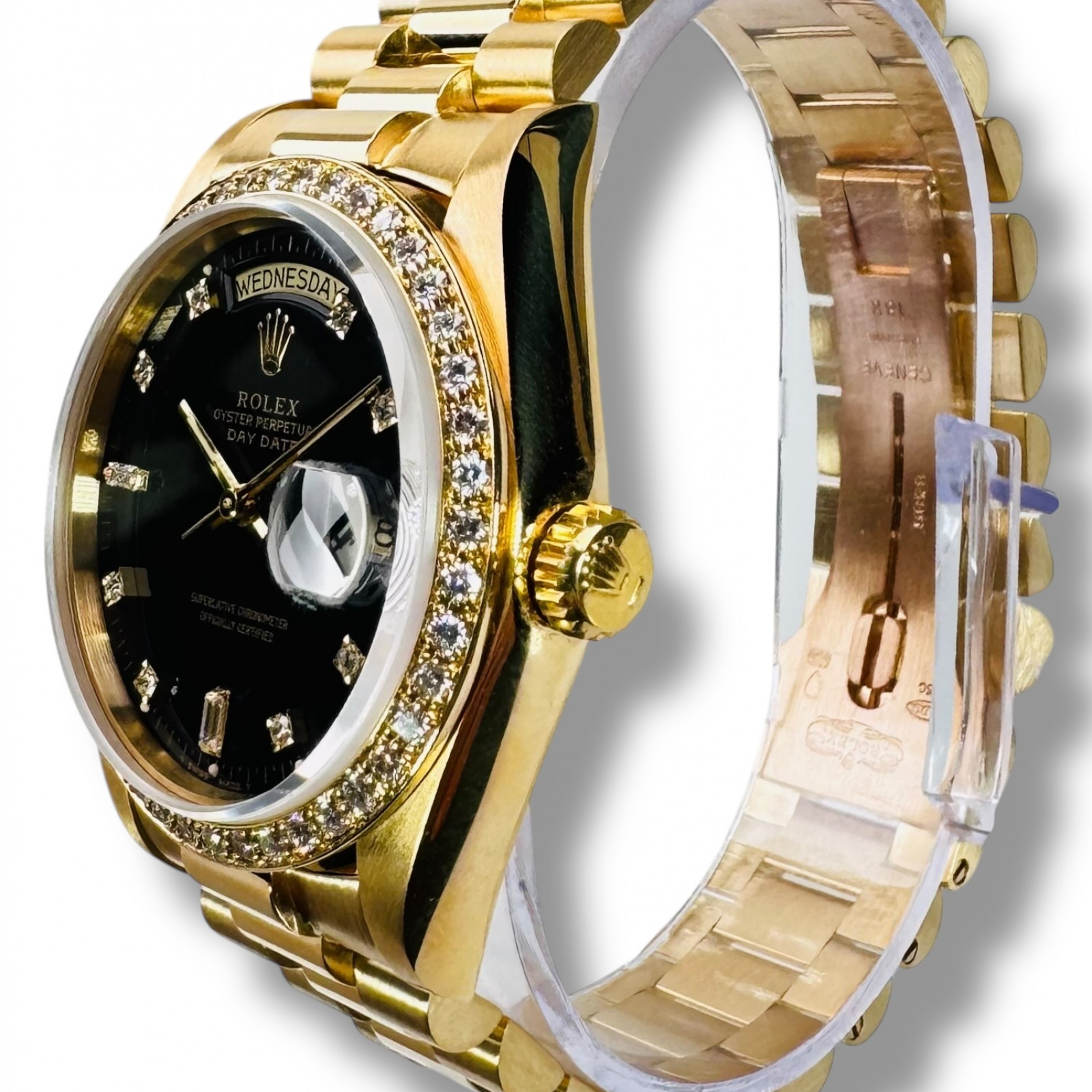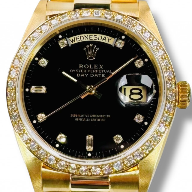 Emerging from the hallowed portals of the Rolex Factory is this wonder piece showcasing a meticulously designed diamond bezel complimented by an enigmatic Black Diamond Dial, adding an undeniable allure, making this Rolex 18048 not just a functional chronometer but a pricelessly treasured masterpiece that reflects the intricate artistry, groundbreaking innovation, and the legacy of relentless pursuit of perfection associated with the watchmaking powerhouse, Rolex.