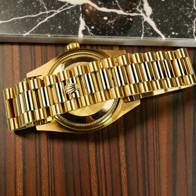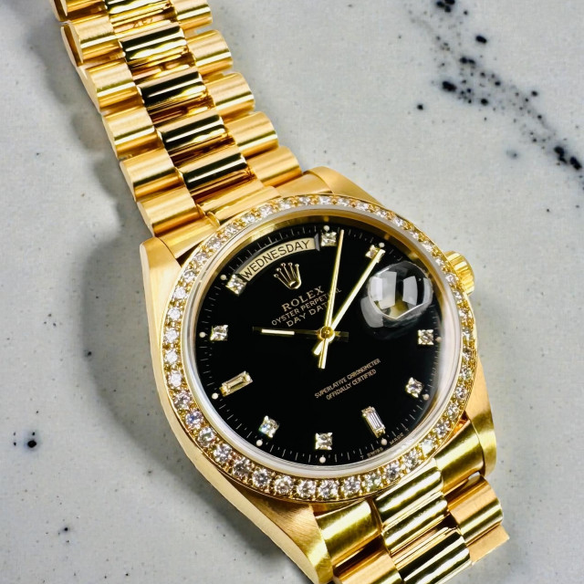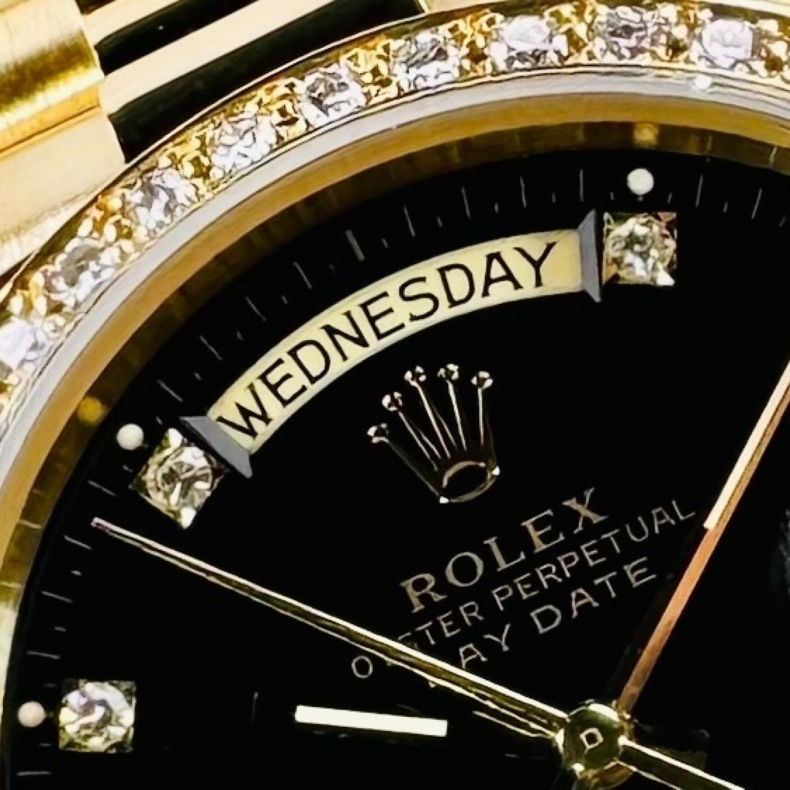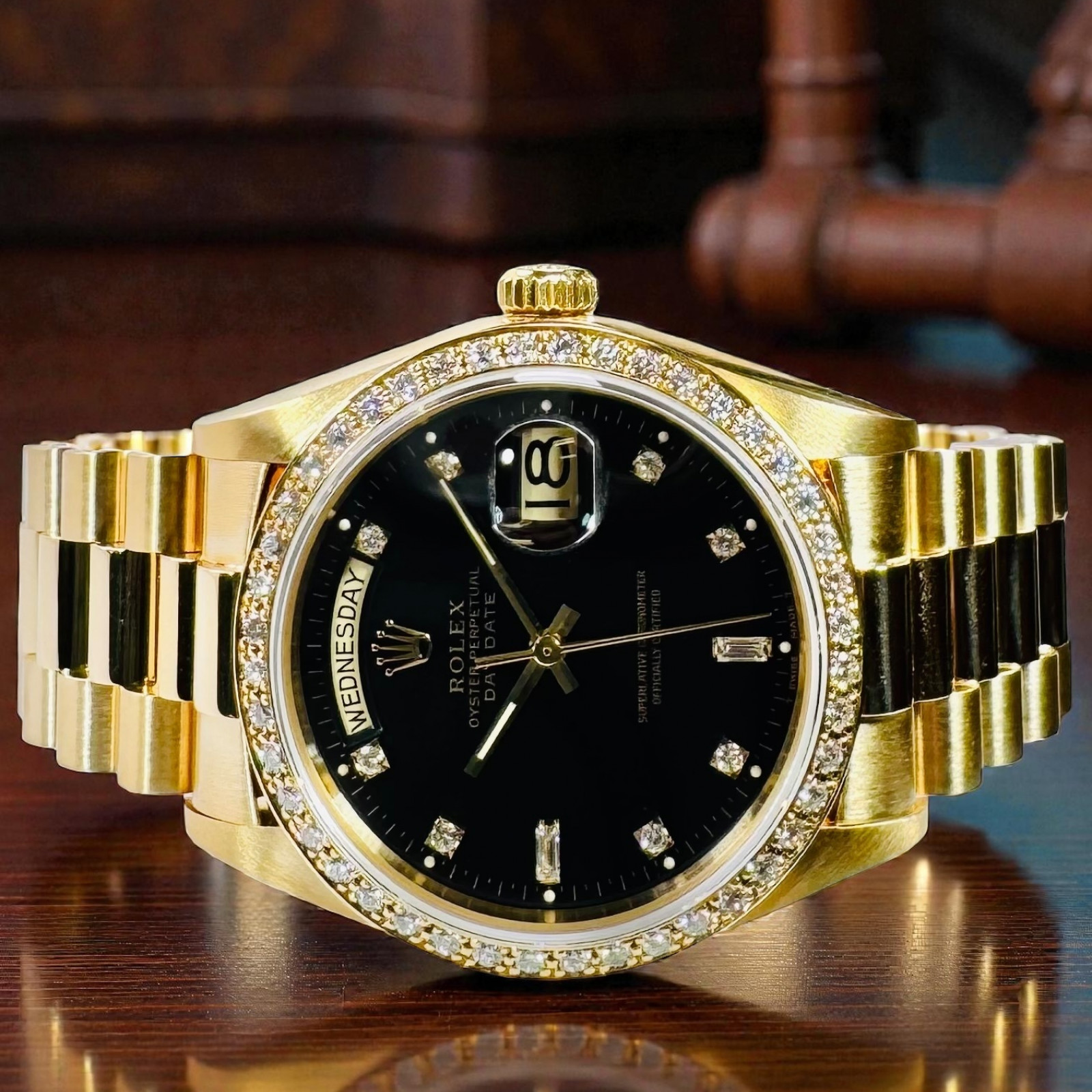 Undeniably, the primary draw of the Rolex 18048 is the captivating allure it possesses; the watch face is adorned traditionally with a custom Black Diamond Dial and diamond-encrusted bezel, beautifully highlighted by gleaming gold hands. These thoughtful embellishments further elevate its sophisticated charm. Complementing this striking dial is the coveted and highly sought-after Presidential-style bracelet model 88723, bearing a discerning bark finish, adding an element of unique texture that sets it apart from its contemporaries.
