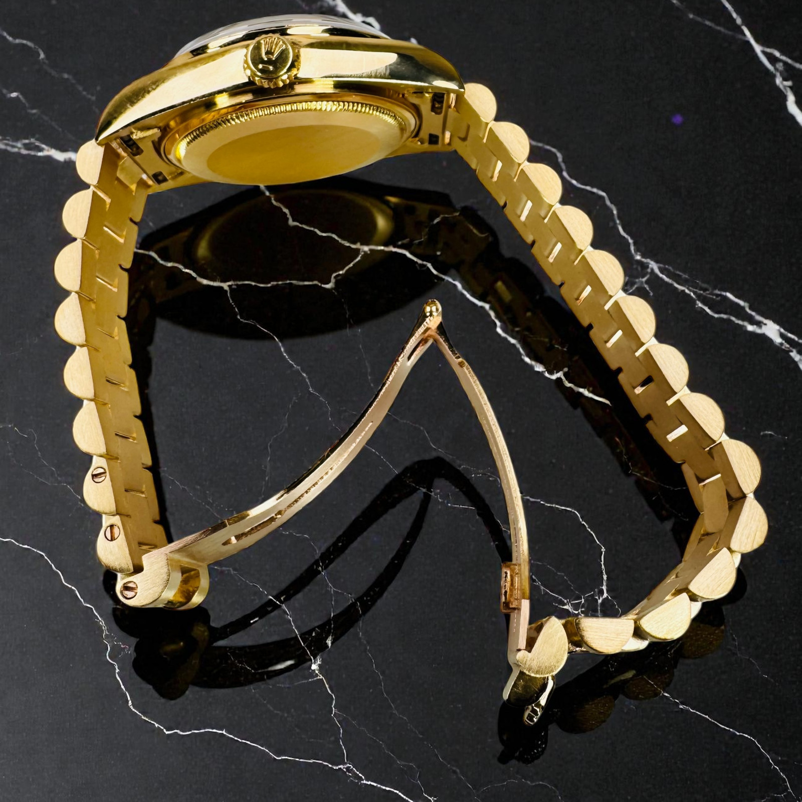 Indulge in the regality of absolute opulence with the vividly striking and profoundly magnificent Rolex 18048, embodying enduring exemplification of watchmaking craftsmanship, renowned world-over, extravagantly balanced with an irresistible touch of lavish elegance. Artisanally sculpted to perfection from 18kt pure, faultless gold, this opulent timepiece emanates an unrestrained sense of grandiosity and prestige, articulating an authentic representation of the iconic brand that Rolex has grown to become over generations.