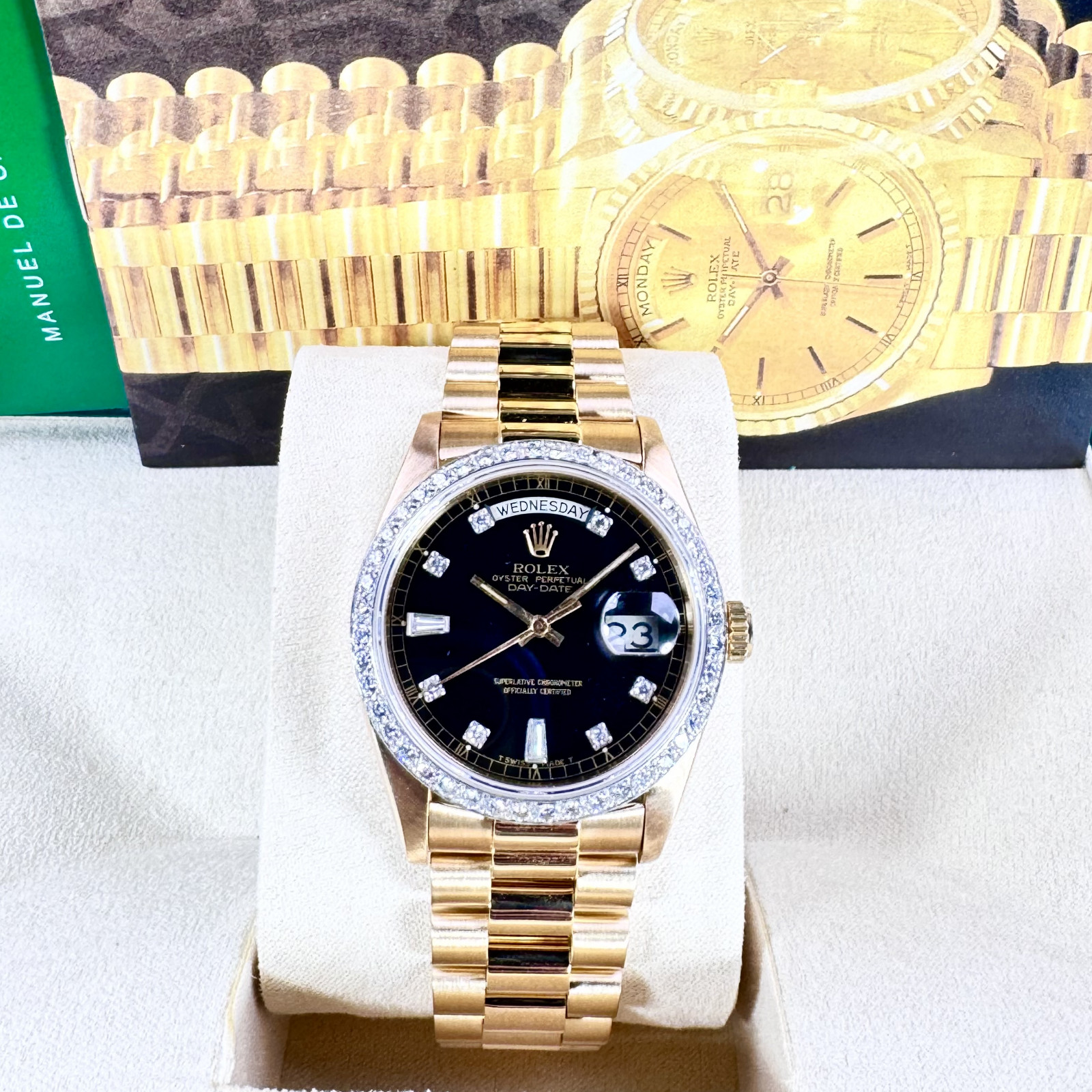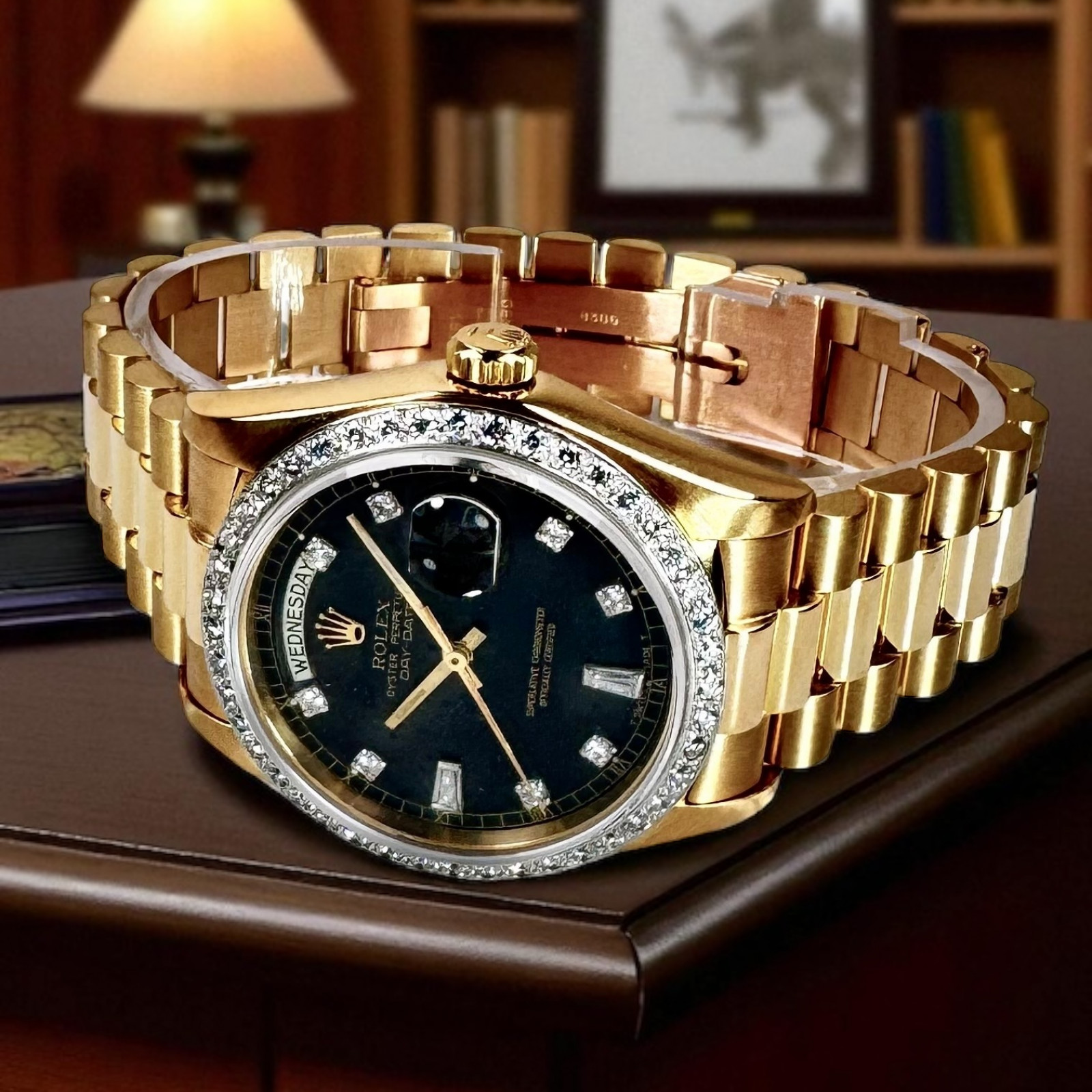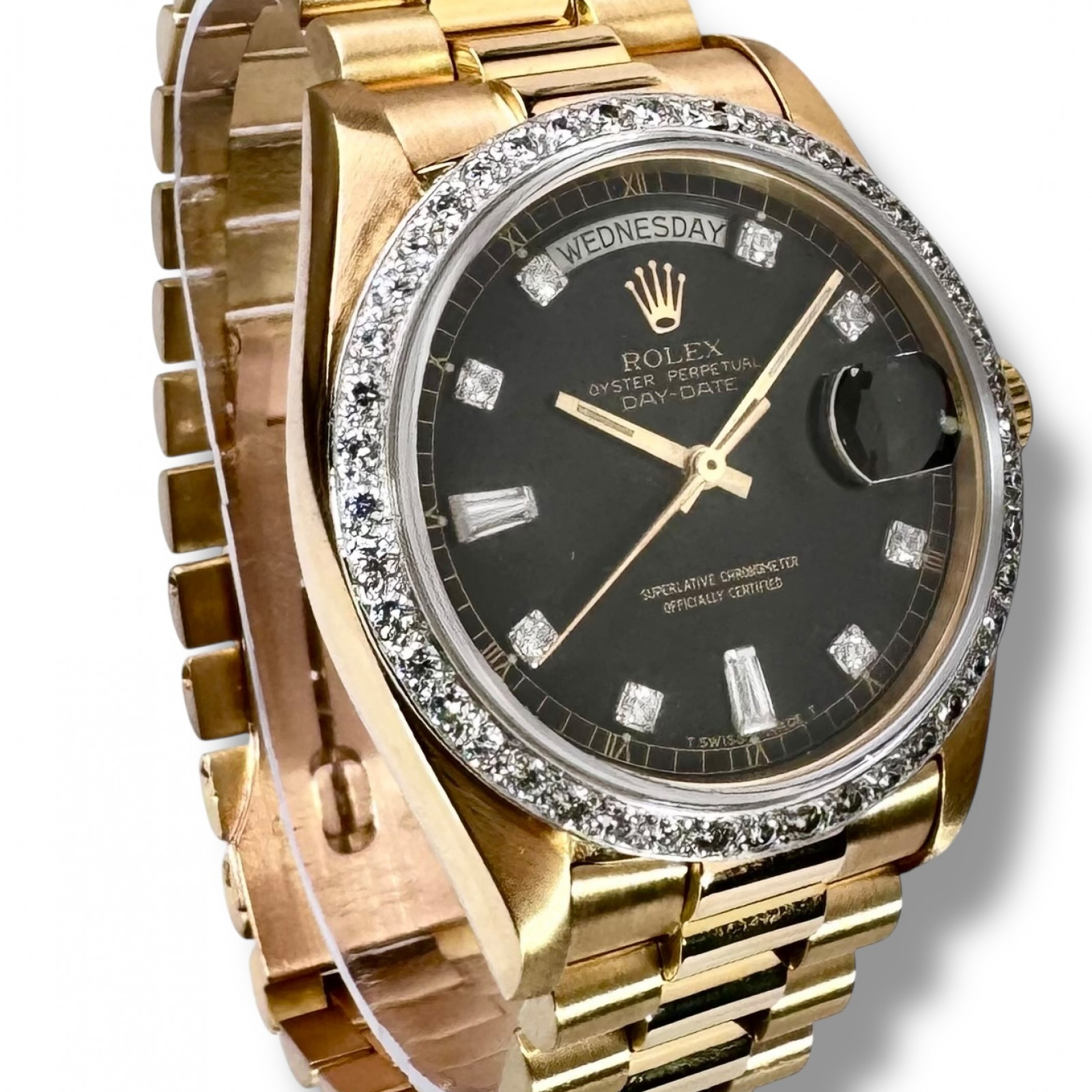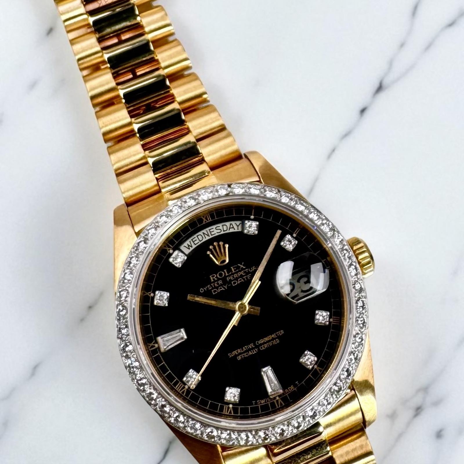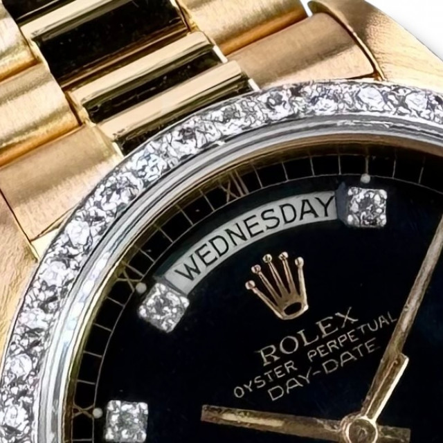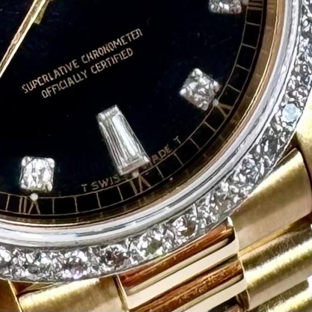 In terms of visual appeal, the Rolex 18048 is traditionally adorned with a captivating custom Black Diamond Dial and diamond bezel, encircled beautifully by matching gold hands – an embellishment that escalates its sophistication. Accompanying this impressive dial is the highly-sought-after Presidential-style bracelet model 88723, which displays a discerning bark finish, injecting a unique texture that distinguishes it from other watches.