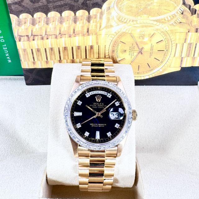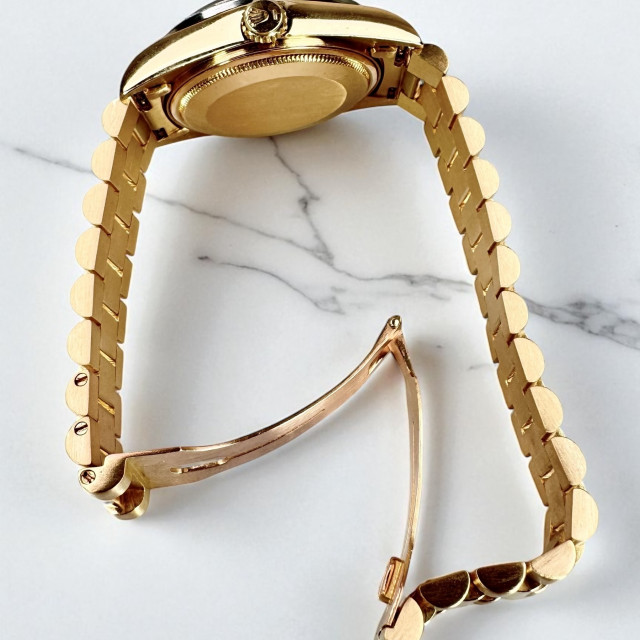 Immerse yourself in opulence with the striking Rolex 18048 – a timeless embodiment of watchmaking craftsmanship and lavish elegance. Crafted meticulously from 18kt solid gold, this luxurious timepiece radiates a level of grandeur and prestige that paints a true representation of the Rolex brand. Beyond its undeniable allure, the 18048 is more than just a functional timepiece; it is a valuable masterpiece that reflects the intricate artistry and innovation synonymous with Rolex.
