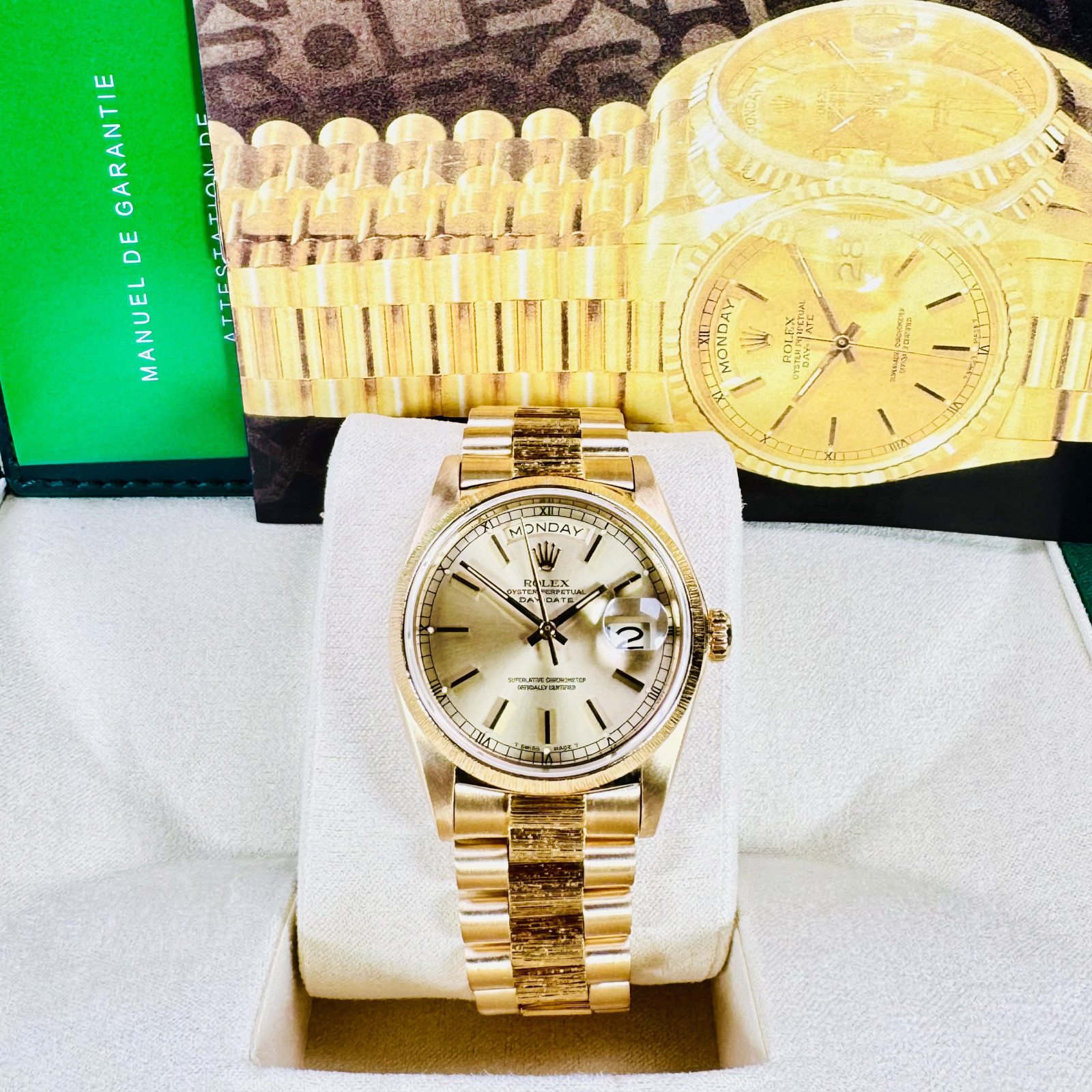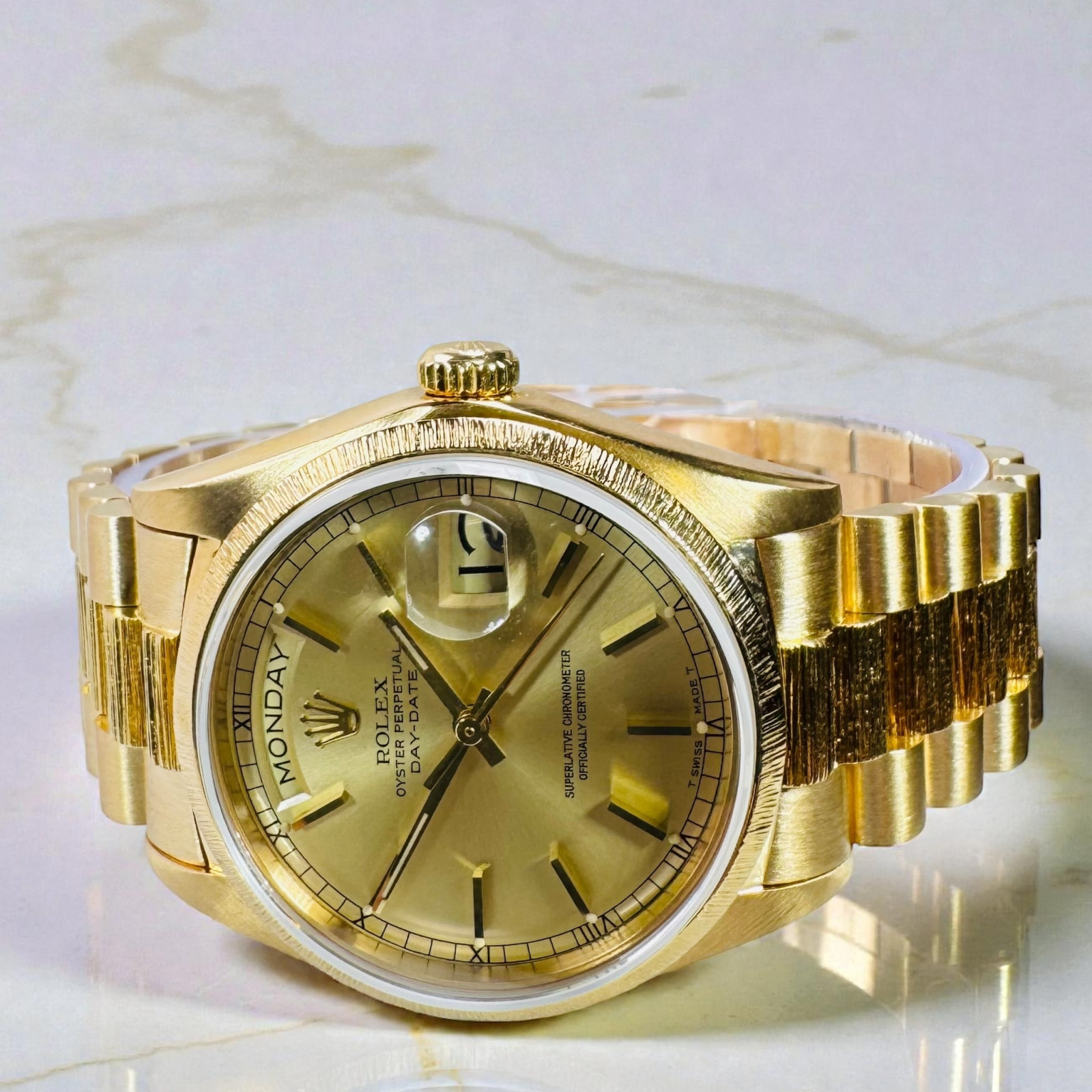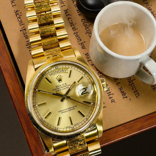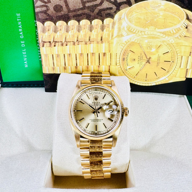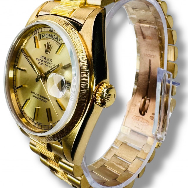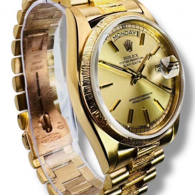 Whether a watch enthusiast, a lover of luxury, or a man of style who appreciates timeless elegance, the Rolex Day-Date 18078 with Bark Finish on the bracelet and bezel would be a perfect addition to your collection. It speaks volumes about your refined taste and elegant demeanor. Discover the enduring charm and the unbeatable performance of this Rolex timepiece, designed to complement every occasion.