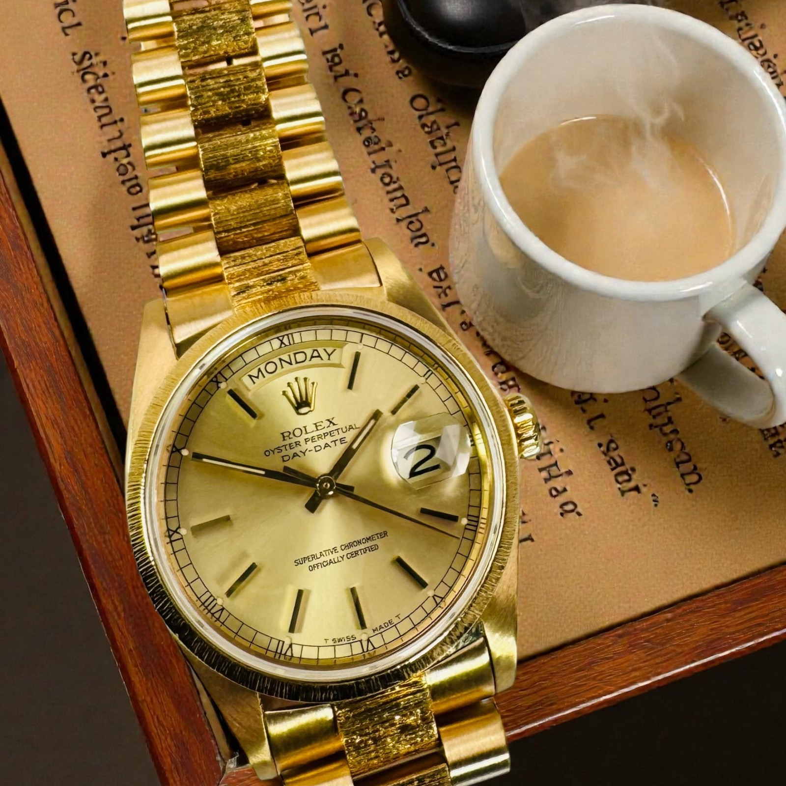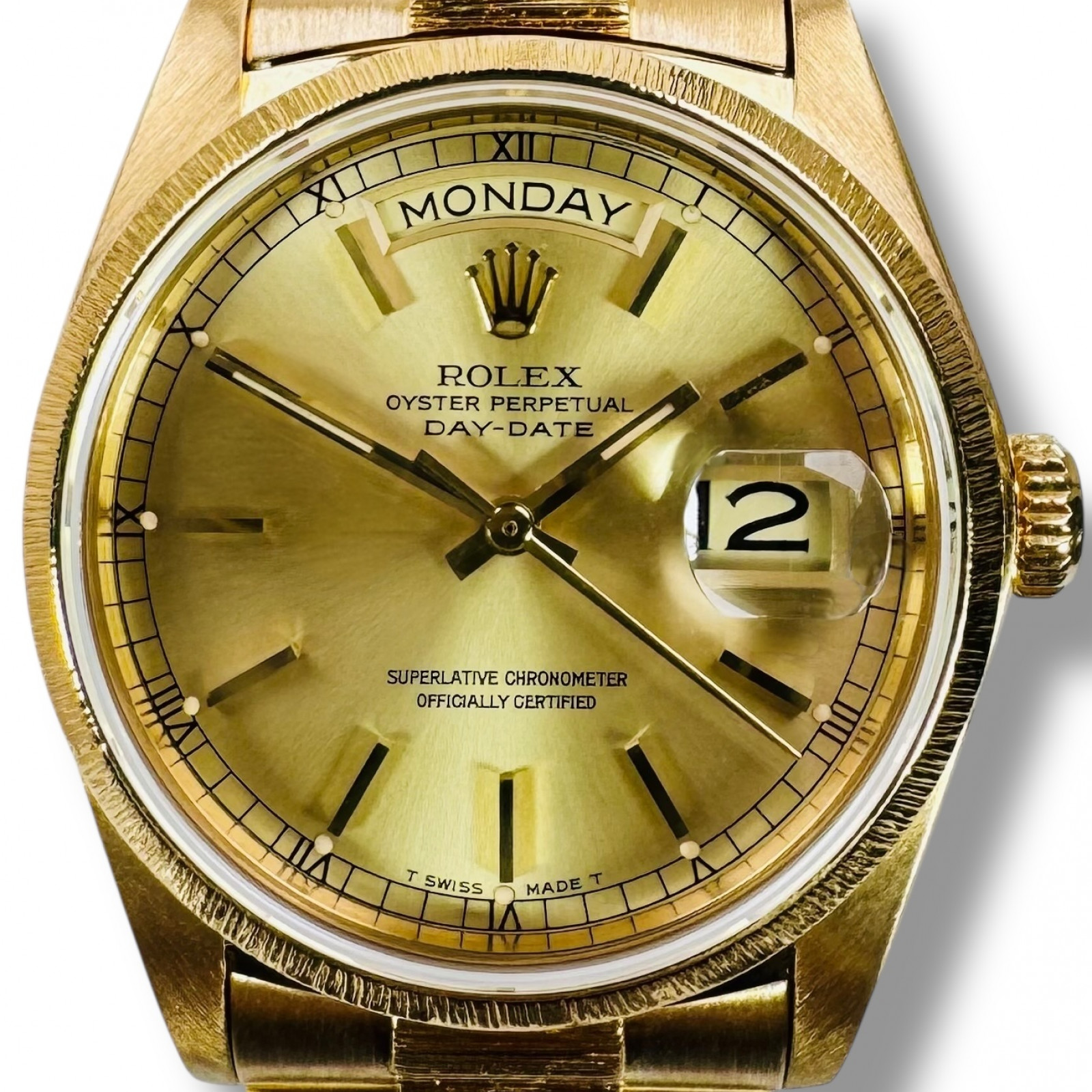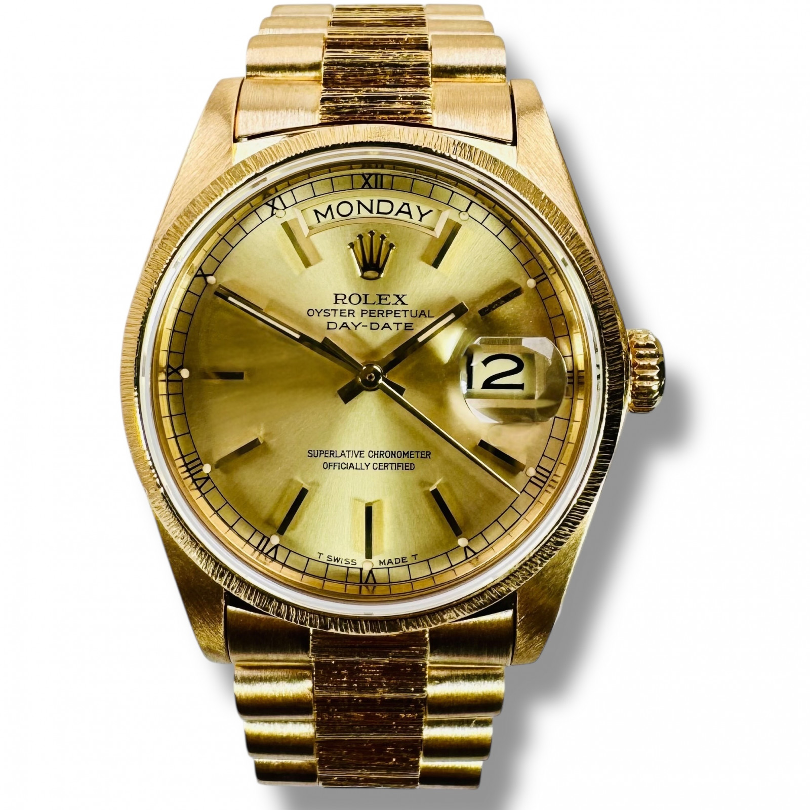 Whether a watch enthusiast, a lover of luxury, or a man of style who appreciates timeless elegance, the Rolex Day-Date 18078 with Bark Finish on the bracelet and bezel would be a perfect addition to your collection. It speaks volumes about your refined taste and elegant demeanor. Discover the enduring charm and the unbeatable performance of this Rolex timepiece, designed to complement every occasion.