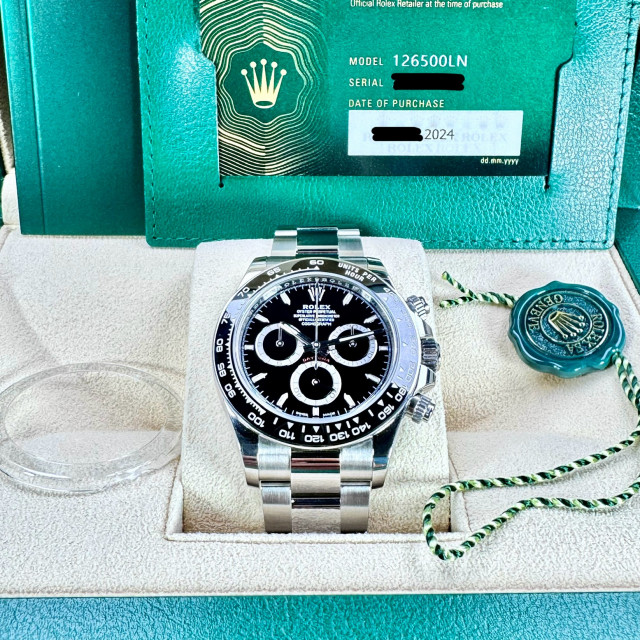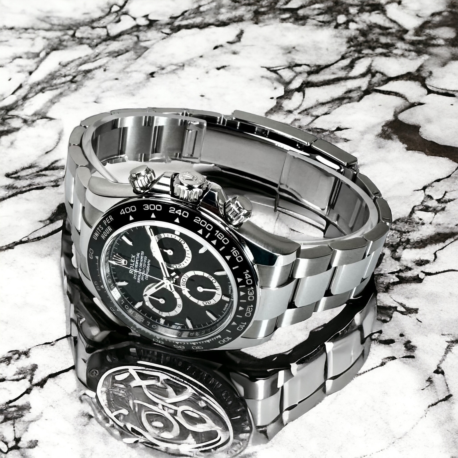 Categorized as "unworn", this Rolex Daytona maintains an outstandingly pristine condition, essentially appearing as an untouched gem within the exclusive world of luxury timepieces. Due to its extremely limited production in response to high demand, the Daytona models are rare finds. The fascinating Rolex Daytona 116500 Black Dial holds not just as a timeless demonstration of watch-making prowess but also as a promising investment. Its resale value continually stands exceptionally robust, often surpassing its original price, making it a desirable treasure for luxury watch collectors worldwide.