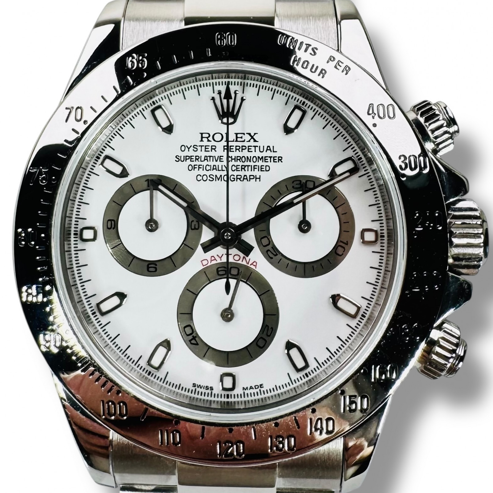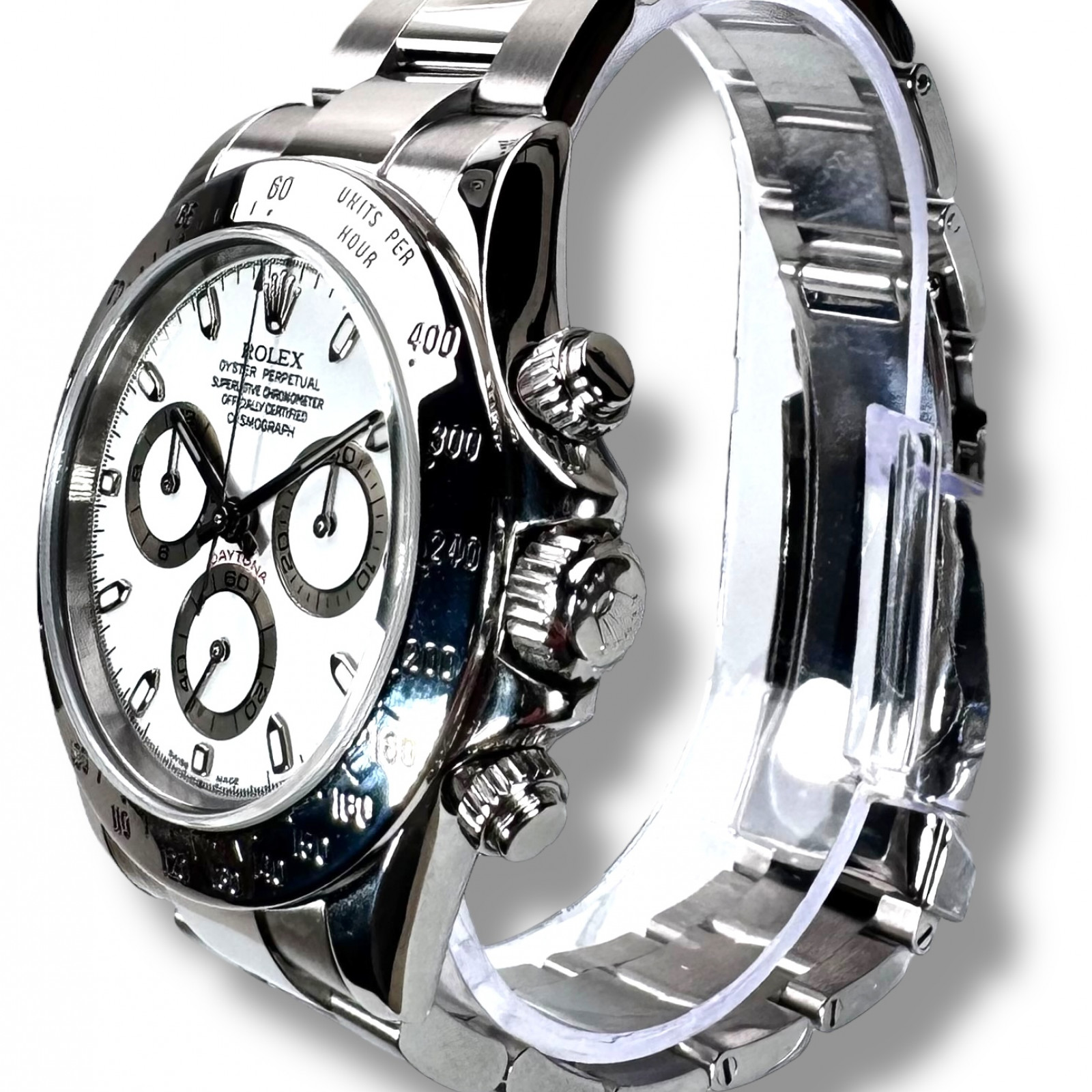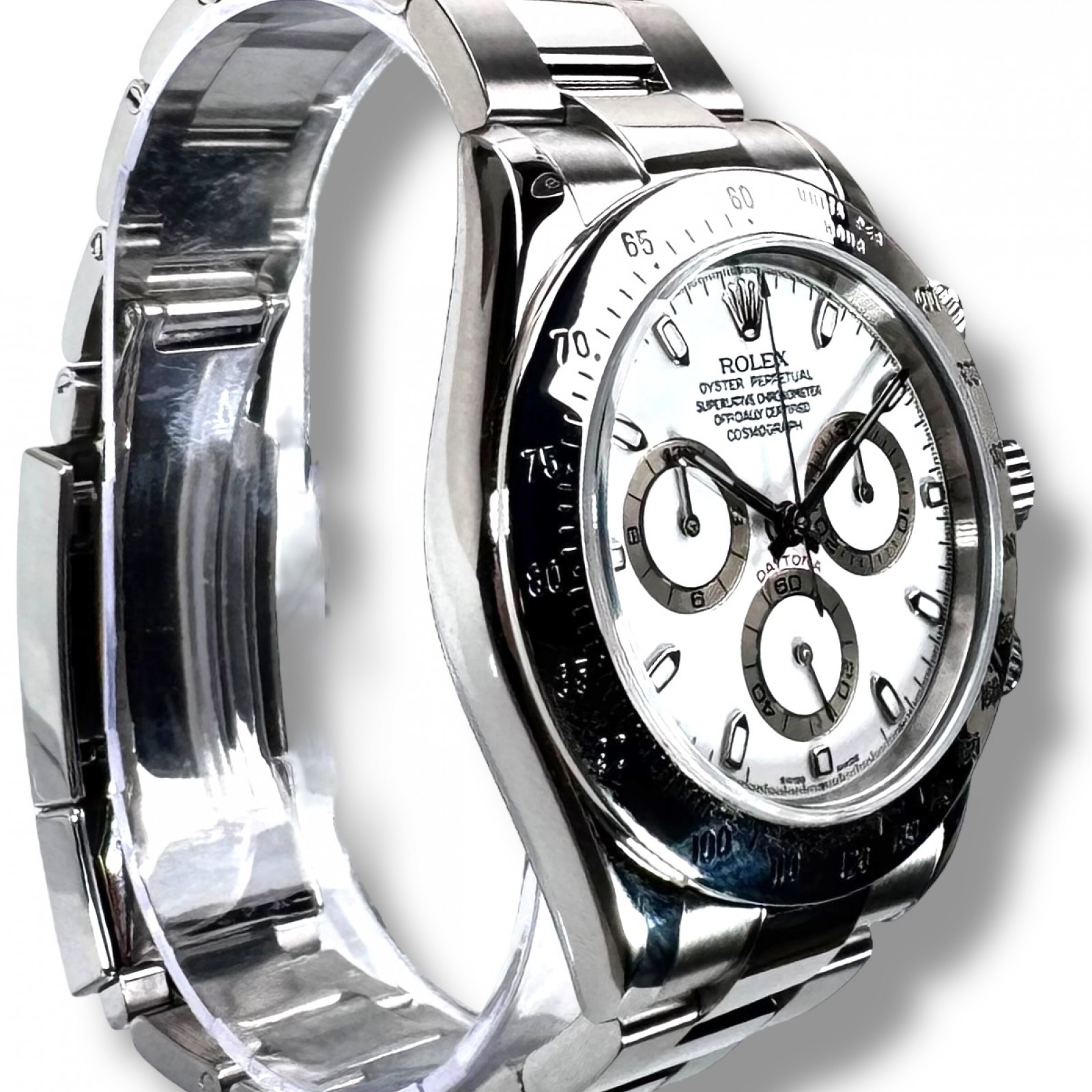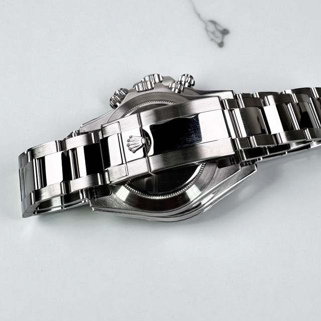 Completing the stylish aesthetic is the bracelet, also crafted from Oystersteel, maintaining the robust and sophisticated feel of the watch. The lustrous Oystersteel combines with the white dial in a harmonious synergy, enhancing the overall appeal and rendering the Rolex Daytona 116520 an indispensable piece in any watch collection.