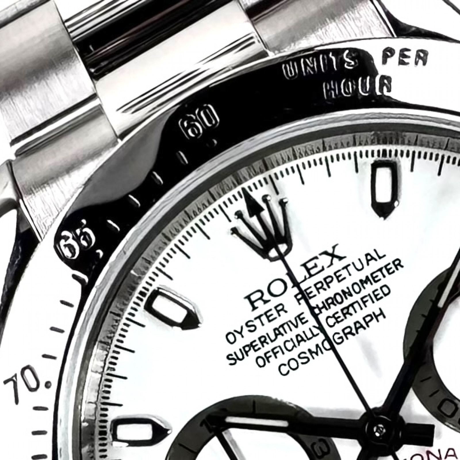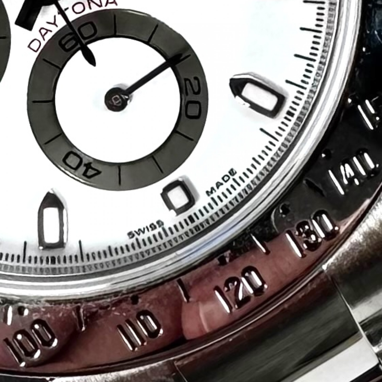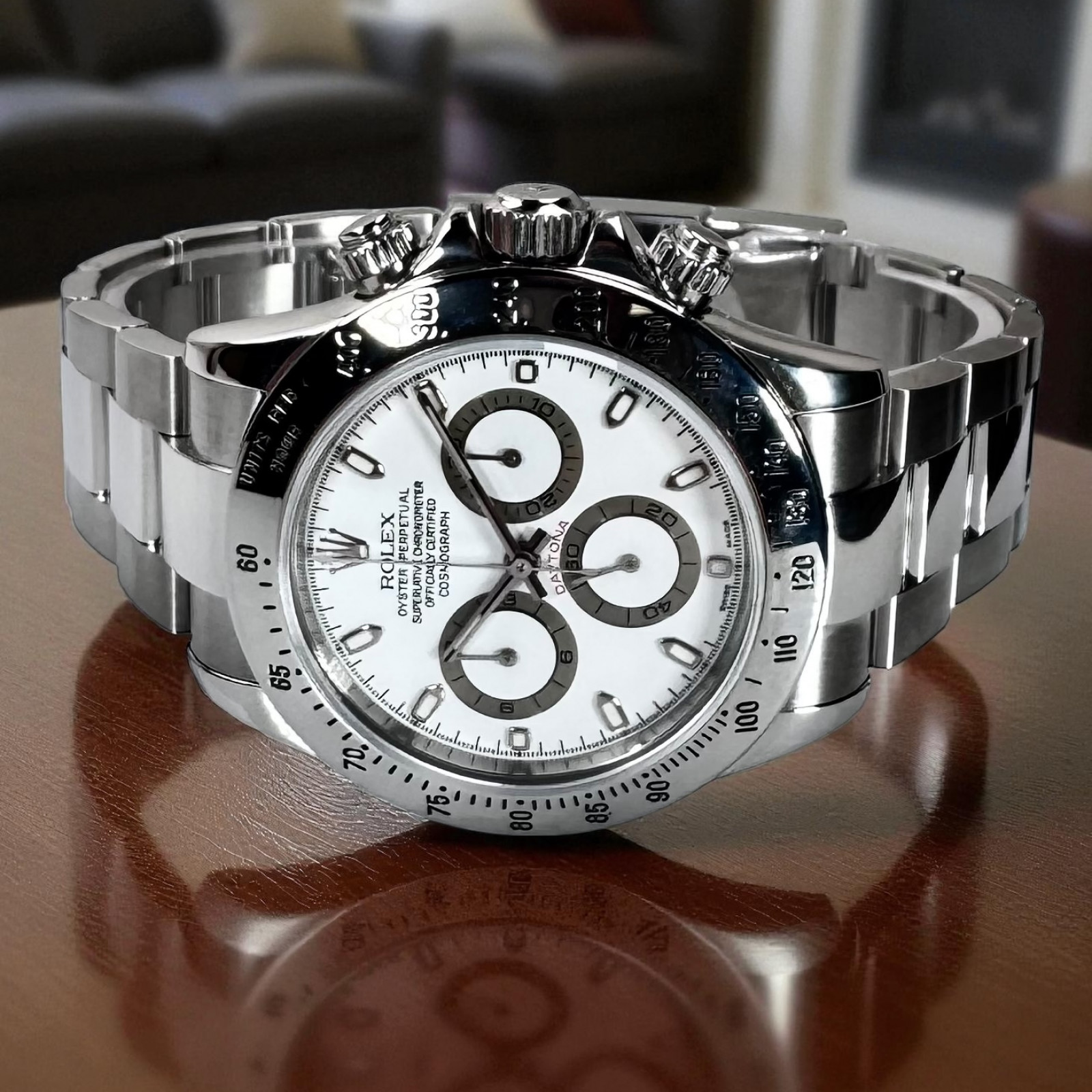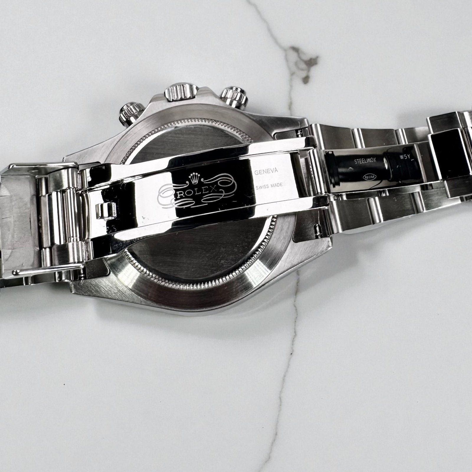 Completing the stylish aesthetic is the bracelet, also crafted from Oystersteel, maintaining the robust and sophisticated feel of the watch. The lustrous Oystersteel combines with the white dial in a harmonious synergy, enhancing the overall appeal and rendering the Rolex Daytona 116520 an indispensable piece in any watch collection.