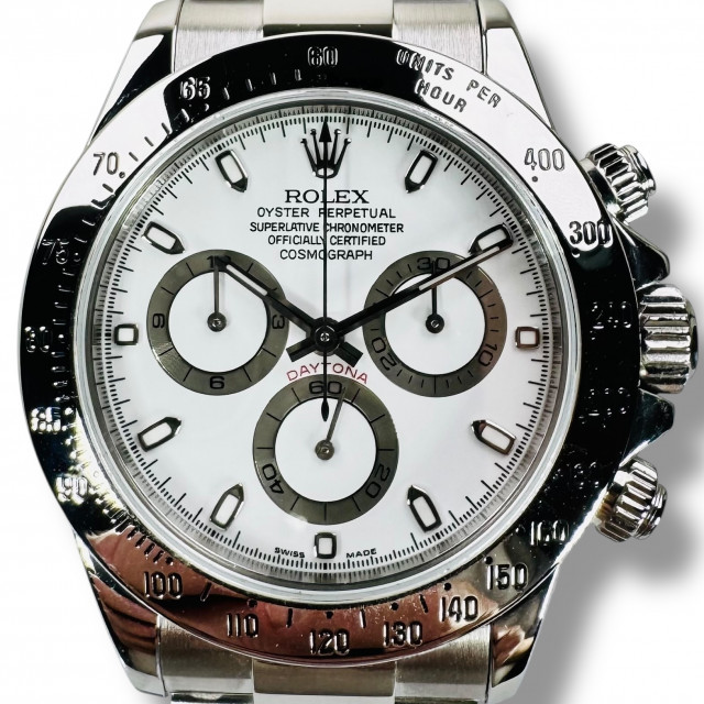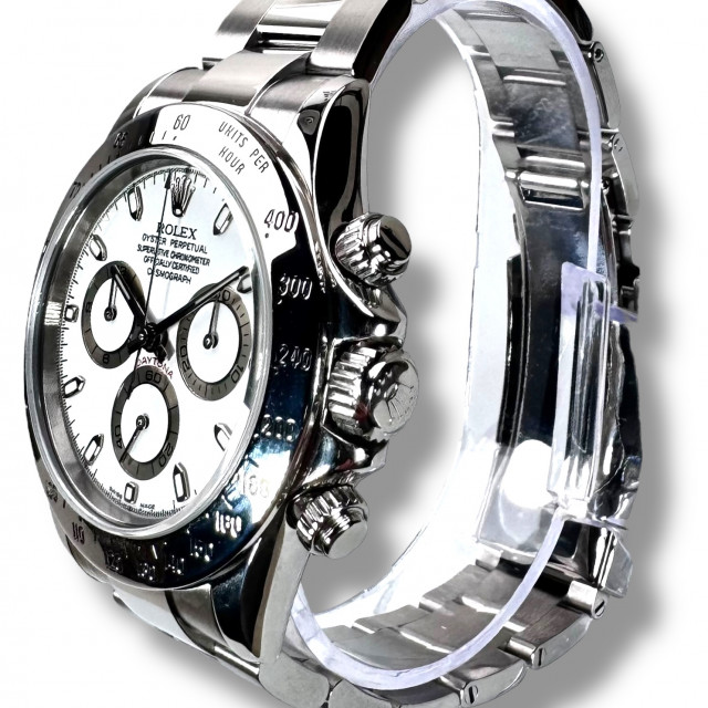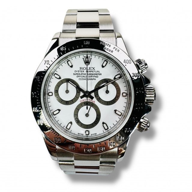 Introducing the legendary Rolex Daytona 116520, a highly collectible timepiece that presents a beloved white dial variant. This particular piece promises not only superior aesthetic appeal but also incorruptible functionality and durability. It is an exemplar of Rolex's commitment to mastery in precision timekeeping and a symbol of pure luxury.