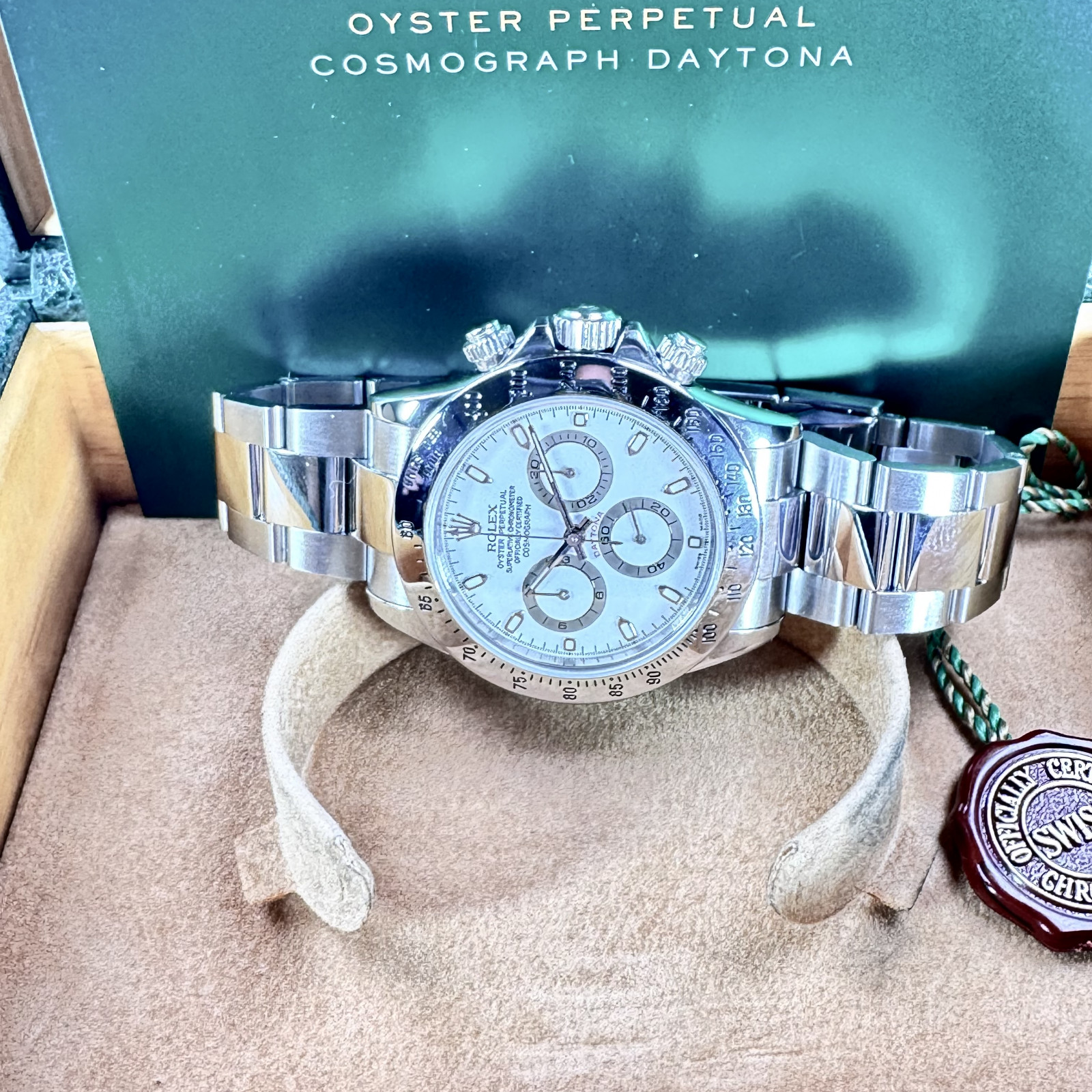 At the heart of the Rolex Daytona 116520 beats the Perpetual, mechanical chronograph: a self-winding movement Caliber 4130. It's a reliable, high-performance movement, meticulously crafted solely by Rolex's skilled horologists and promises an impressive power reserve of approximately 72 hours.