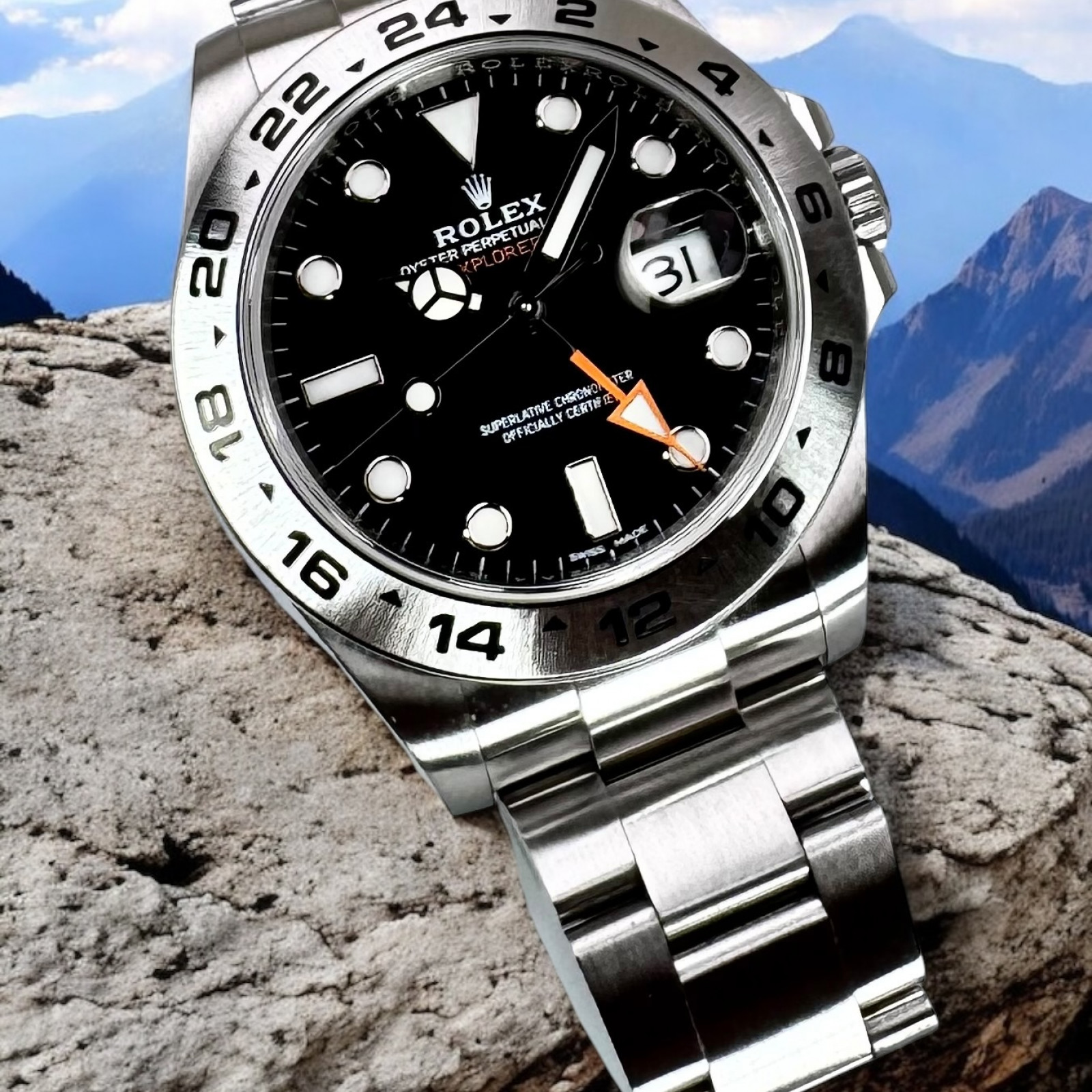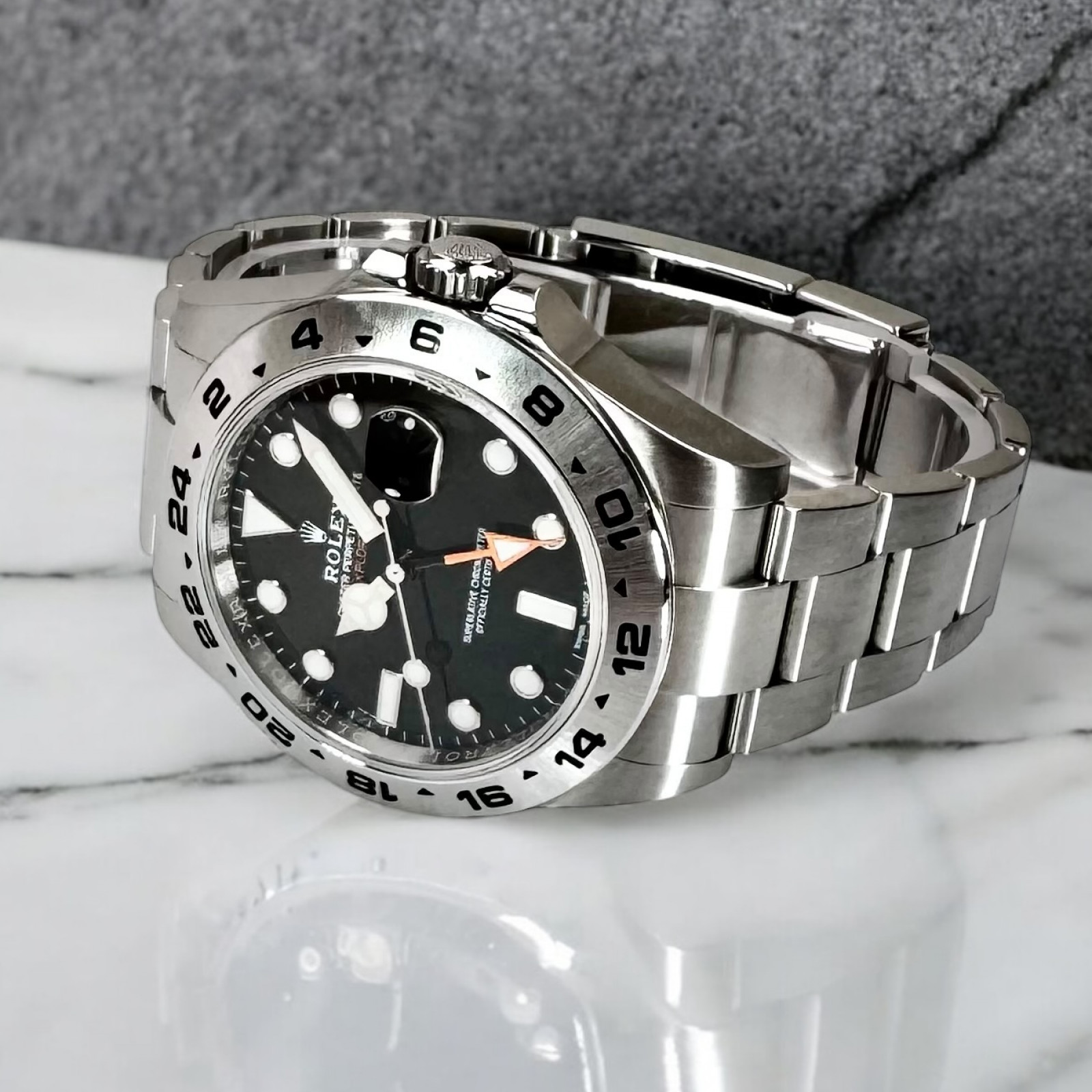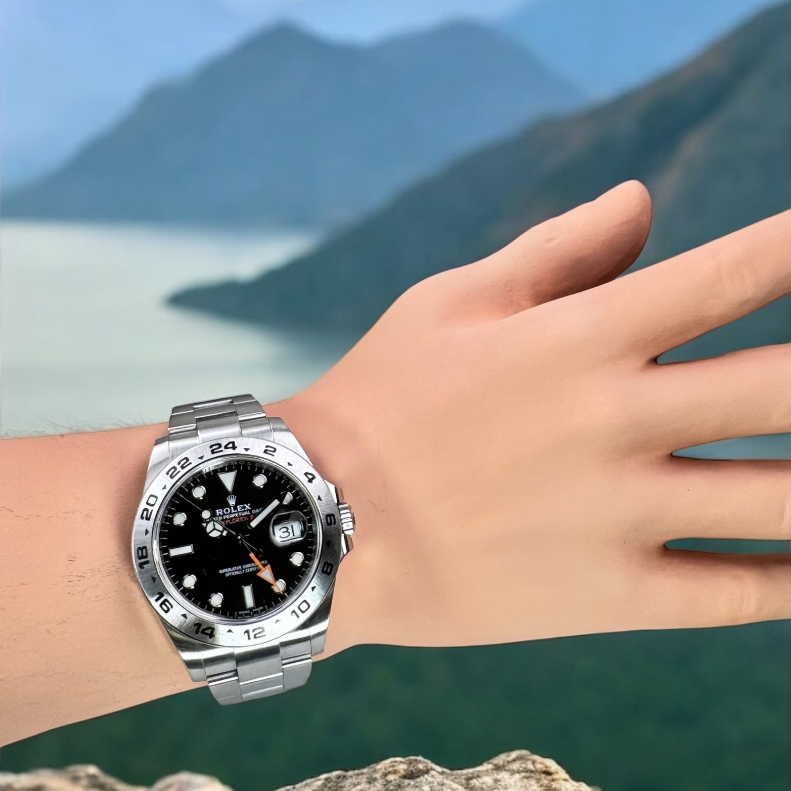 Remarkably, the Rolex Explorer II 216570 is certified waterproof to a depth of 330 feet, assuring robust performance in even the most challenging conditions. Whether you're exploring rugged terrains, traversing oceans, or simply navigating through your day-to-day life, this timepiece is made to withstand it all.
