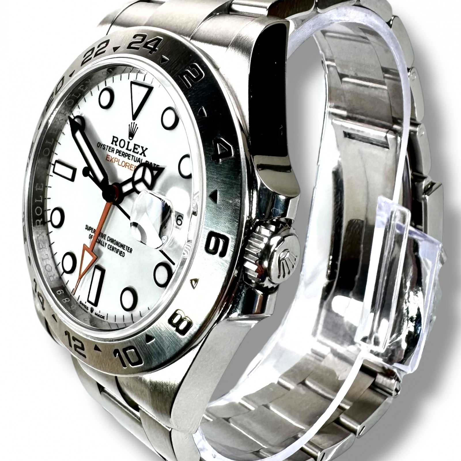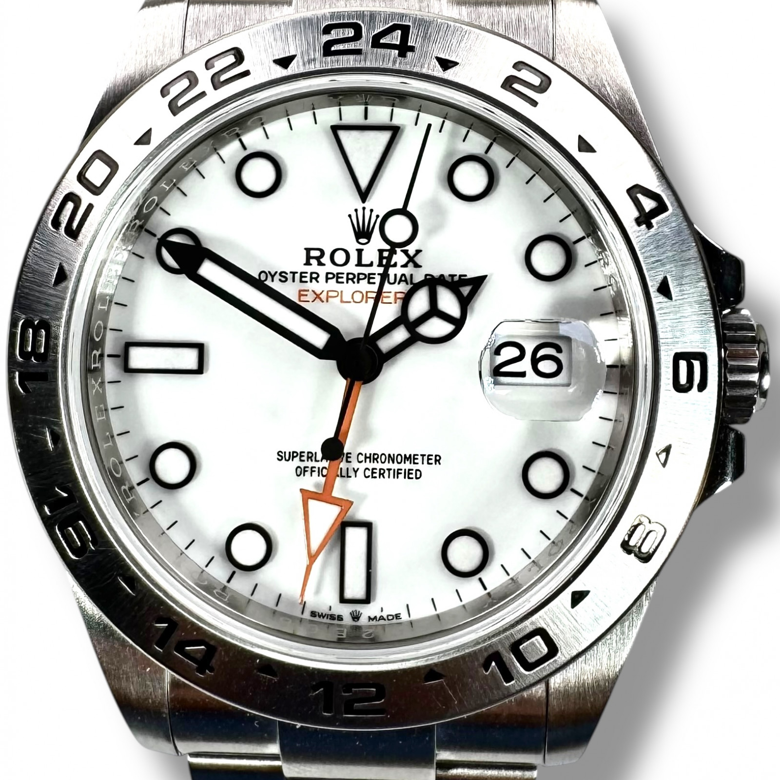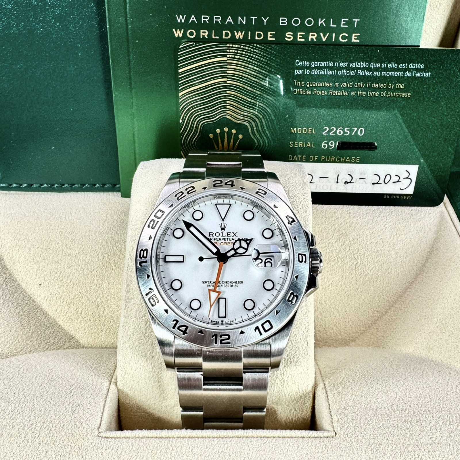In summary, the Rolex Explorer II reference 226570-0001, introduced in 2023, amalgamates the superior Rolex engineering with refined aesthetic detail. Its robust stainless steel architecture, the intelligent self-winding caliber 3285, and the chic white dial come together in a harmonious design. This wristwatch personifies elegance and durability, making a perfect choice for discerning watch lovers and Rolex aficionados. Whether you are a seasoned collector or a first-time luxury watch buyer, this timepiece is a testament to the timeless art that is Rolex watchmaking.