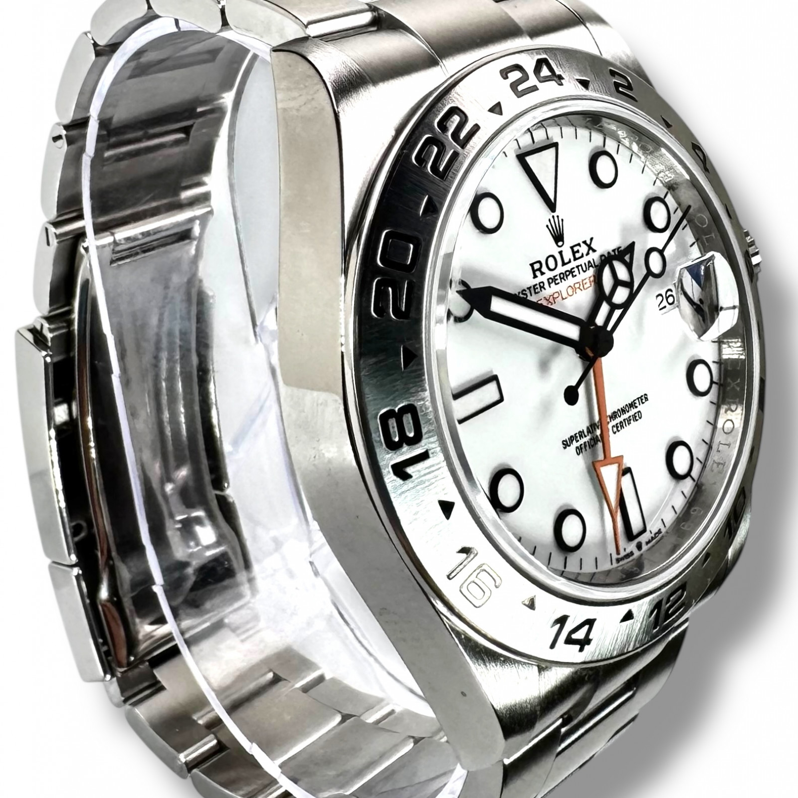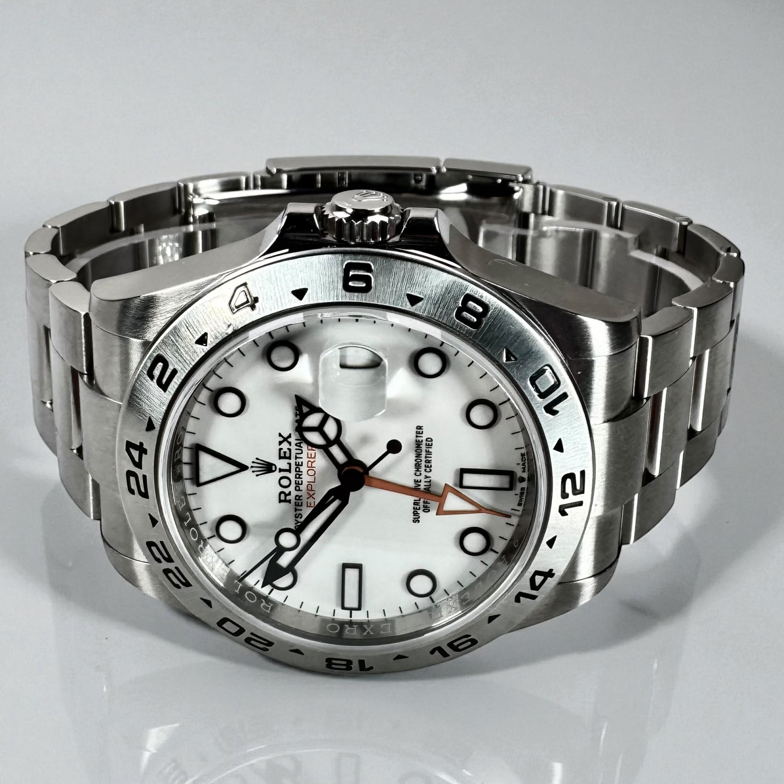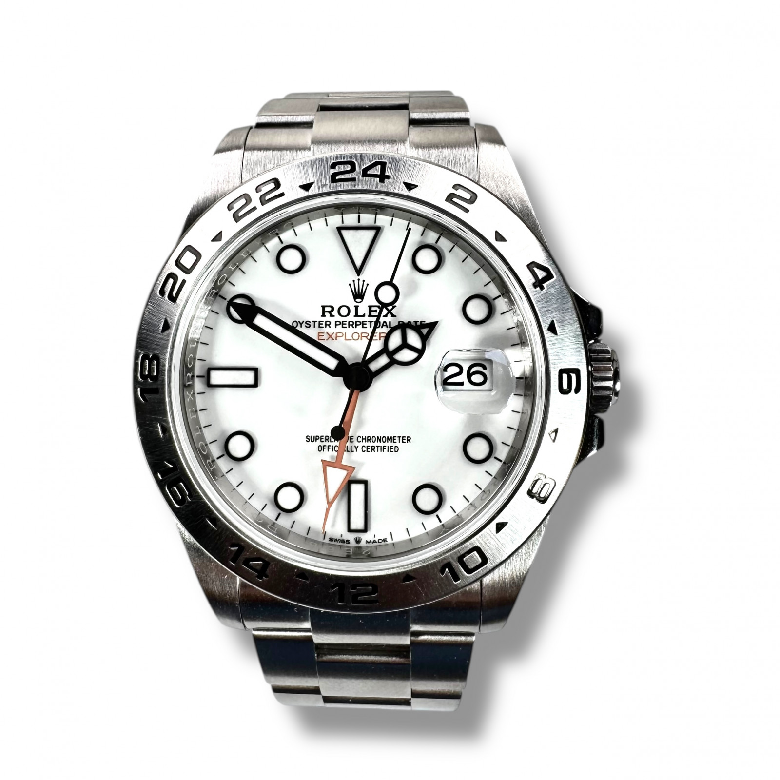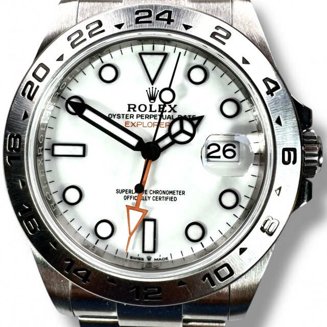 In summary, the Rolex Explorer II reference 226570-0001, introduced in 2023, amalgamates the superior Rolex engineering with refined aesthetic detail. Its robust stainless steel architecture, the intelligent self-winding caliber 3285, and the chic white dial come together in a harmonious design. This wristwatch personifies elegance and durability, making a perfect choice for discerning watch lovers and Rolex aficionados. Whether you are a seasoned collector or a first-time luxury watch buyer, this timepiece is a testament to the timeless art that is Rolex watchmaking.