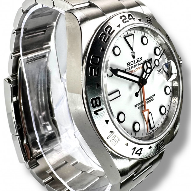 The standout feature of the Rolex Explorer II 226570-0001 is its aesthetically pleasing white dial. It presents a clean, modern look that's highly legible in all lighting conditions due to hour markers and hands coated in a luminescent material. The dial also includes a distinctive hour hand, a date display window for extra functionality, and a fixed 24-hour graduated bezel. This intuitive interface echoes uncompromising quality, unparalleled craftsmanship and sophisticated Rolex technology.