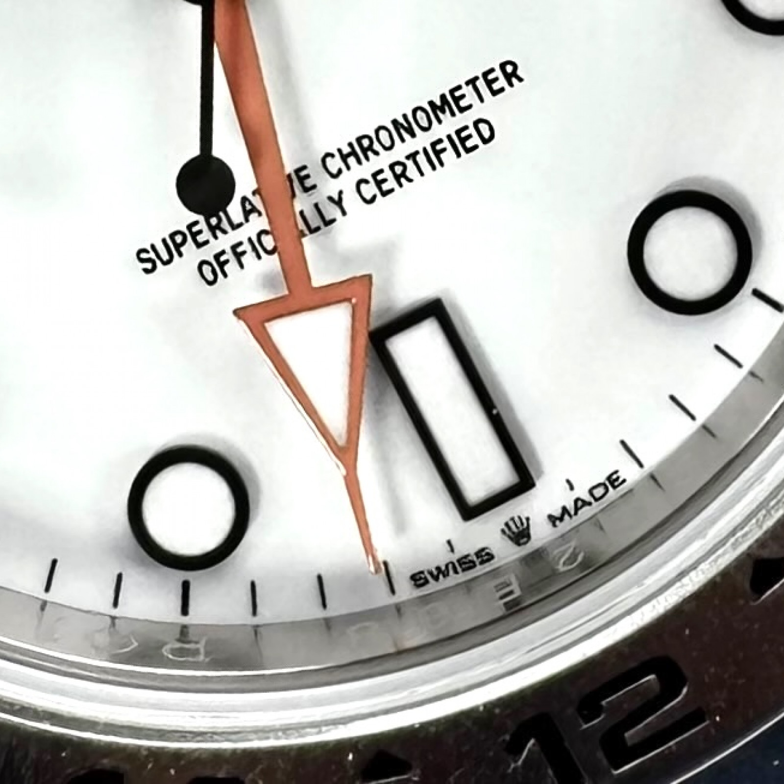 At the heart of this timepiece rests Rolex's self-winding caliber 3285, a testament of exceptional craftsmanship, proven precision, and remarkable accuracy. The 3285 is a new-generation movement manufactured by Rolex itself. It guarantees a power reserve of approximately 70 hours and houses a Parachrom hairspring, offering greater resistance to shocks and temperature variations. Designed for frequent use, it ensures that the Rolex Explorer II keeps on ticking even in the harsh conditions.