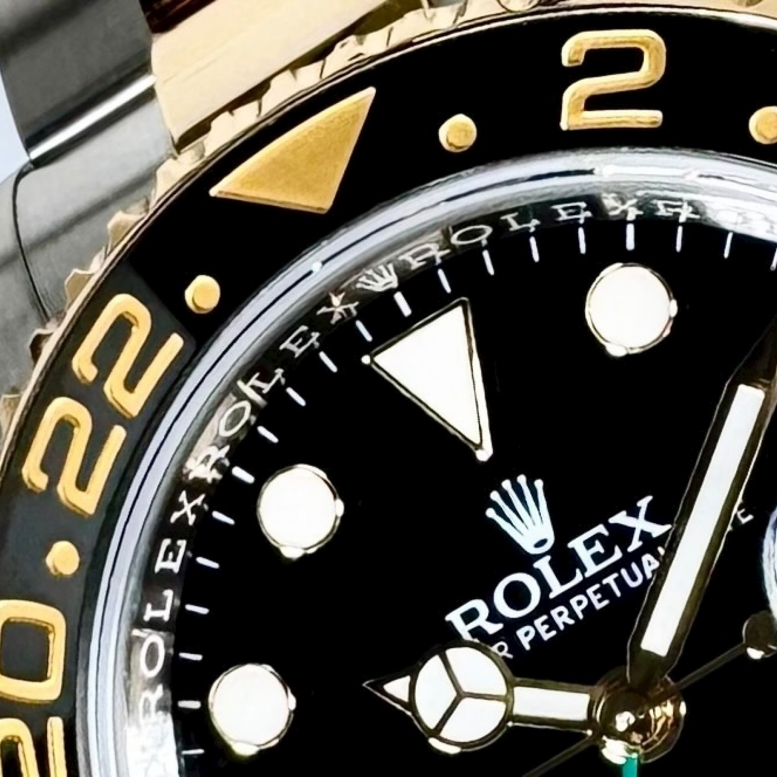 Embellished on top of the resilient case is the distinctive 18KT gold bidirectional rotatable 24-hour graduated bezel. This convenient yet sophisticated feature is significant for jet setters, allowing them to effortlessly track time across two different zones simultaneously. Alongside its practical use, the bezel exudes an elegance that optimally enhances the luxurious feel of the watch.