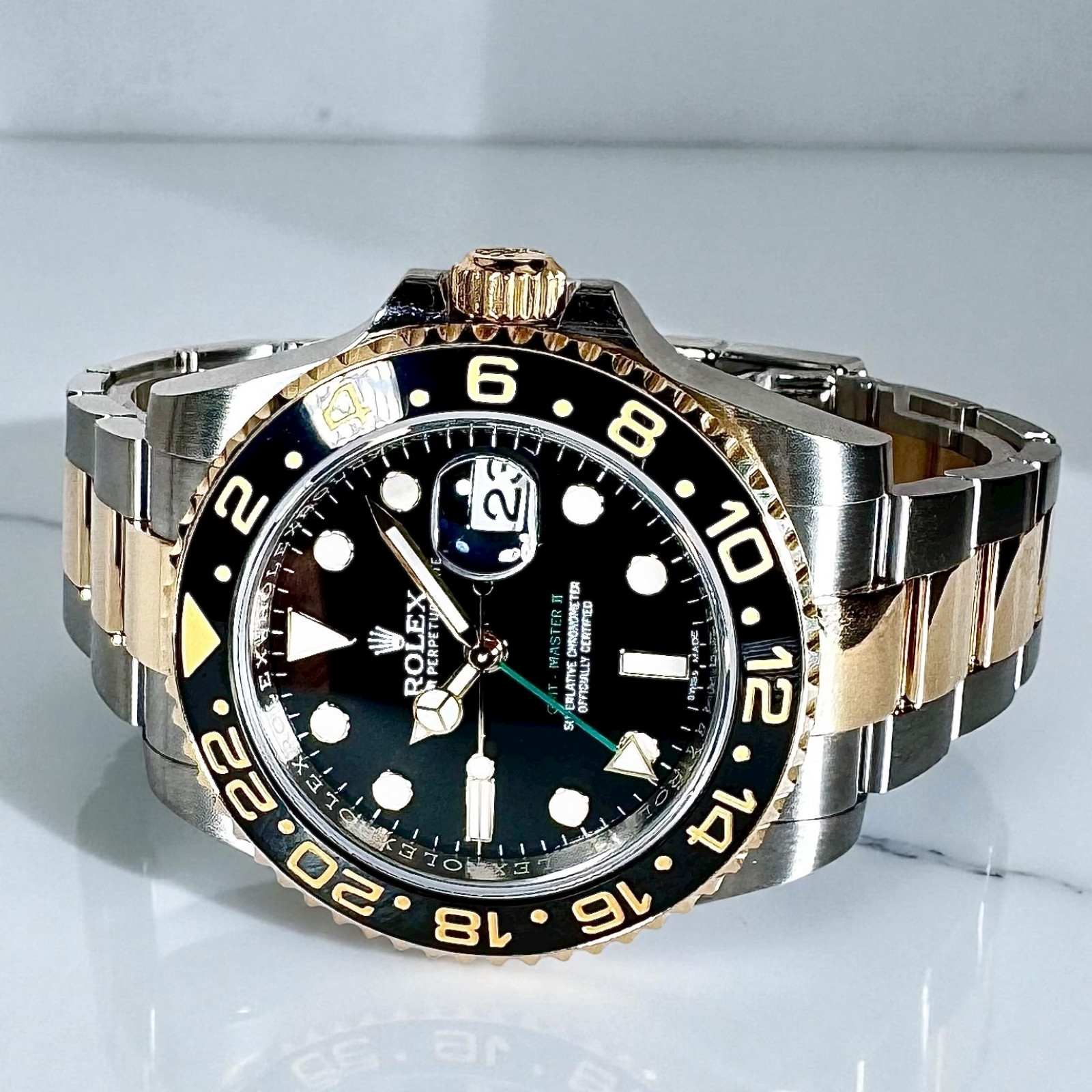 One of the watch's defining features is its state-of-the-art movement - a Perpetual, mechanical self-winding mechanism with a GMT function. This intricate feature is a testament to Rolex's revered watchmaking expertise. By meticulously engineering this movement, Rolex ensures accurate timekeeping and enduring performance for both the main and 24-hour secondary time displays, truly celebrating a blend of technical mastery and design excellence.