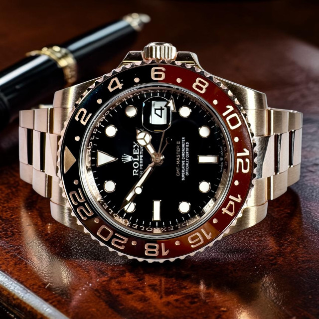 Offering a black and red dial contrasted against a solid 18 karat rose gold strap for added opulence, this watch delivers a visual masterpiece of design and color-play. The gold and black bezel is not only visually sublime but also functional, providing users with the ability to track more than one time zone, making it a travel staple for globetrotters.