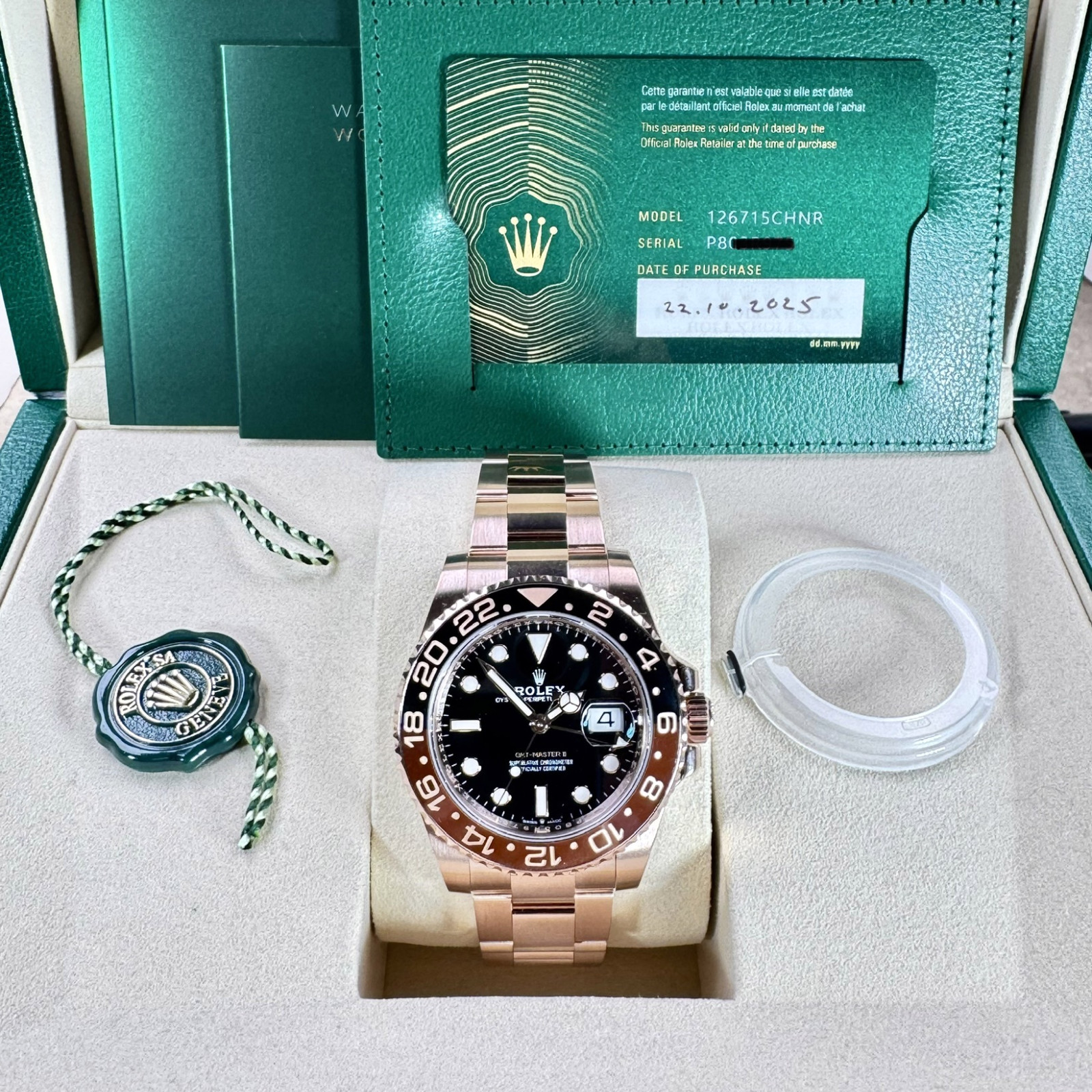Invest today in this unworn, incredible Rolex GMT II 126715CHNR from 2025, and possess a watch that doesn’t only tell time but showcases an unbeatable blend of elegance and functionality. This watch is a jewel, a perfect addition to any luxury collection, and a testament to the horological prowess and sophisticated design that is Rolex.