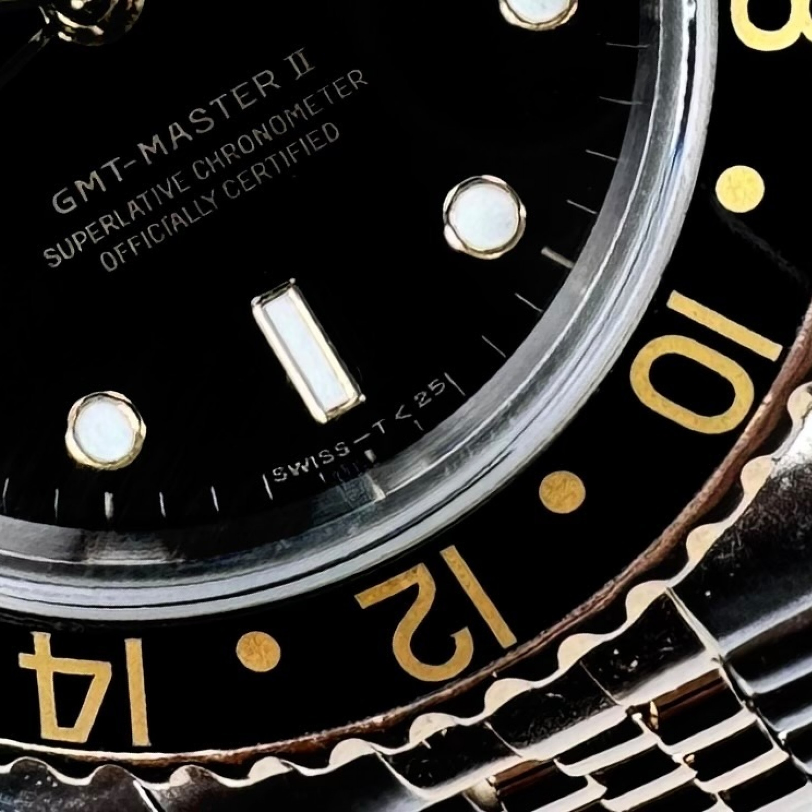 | Bezel: | 18kt Yellow Gold, Black Ceramic, 24 Hour Graduated Bidirectional Rotatable |