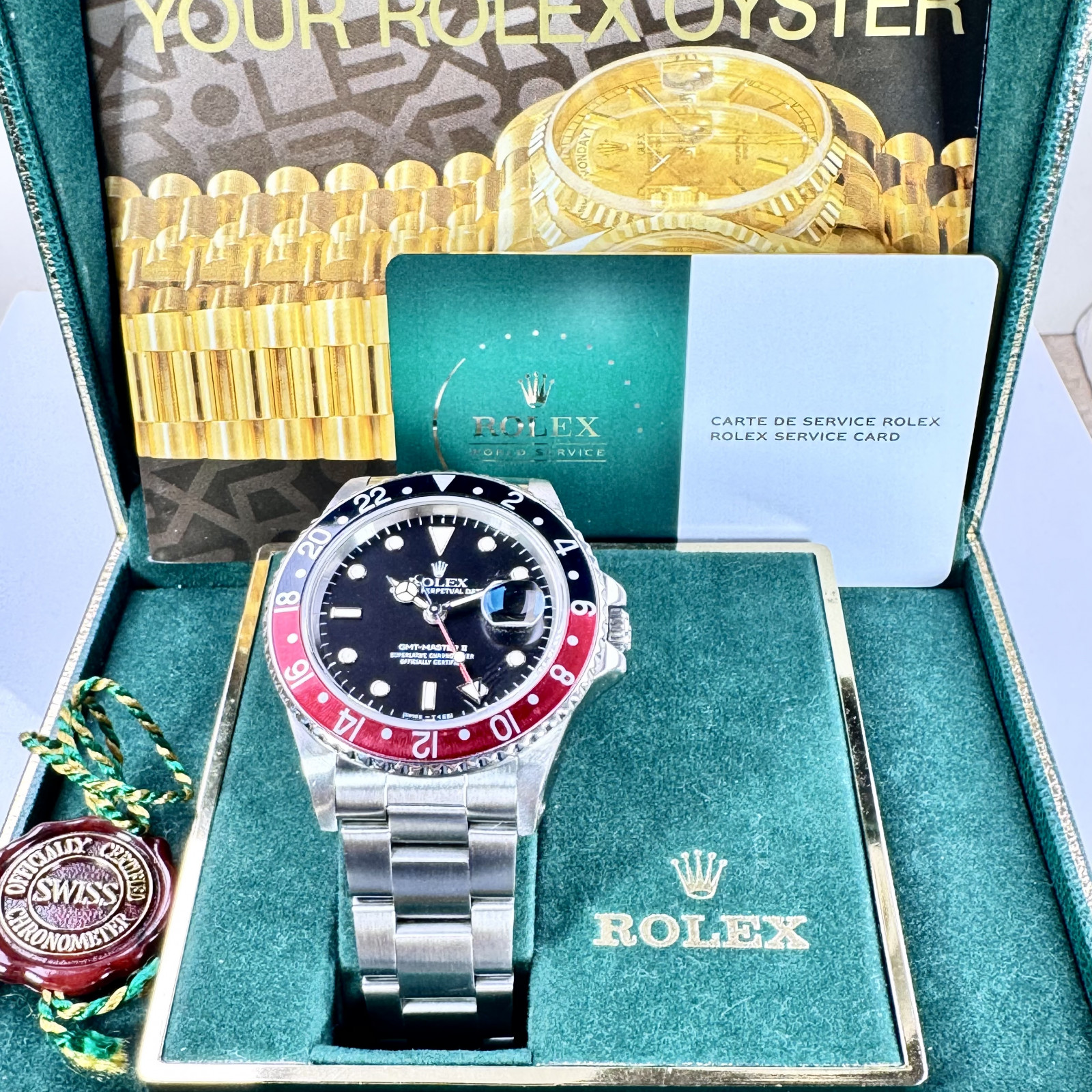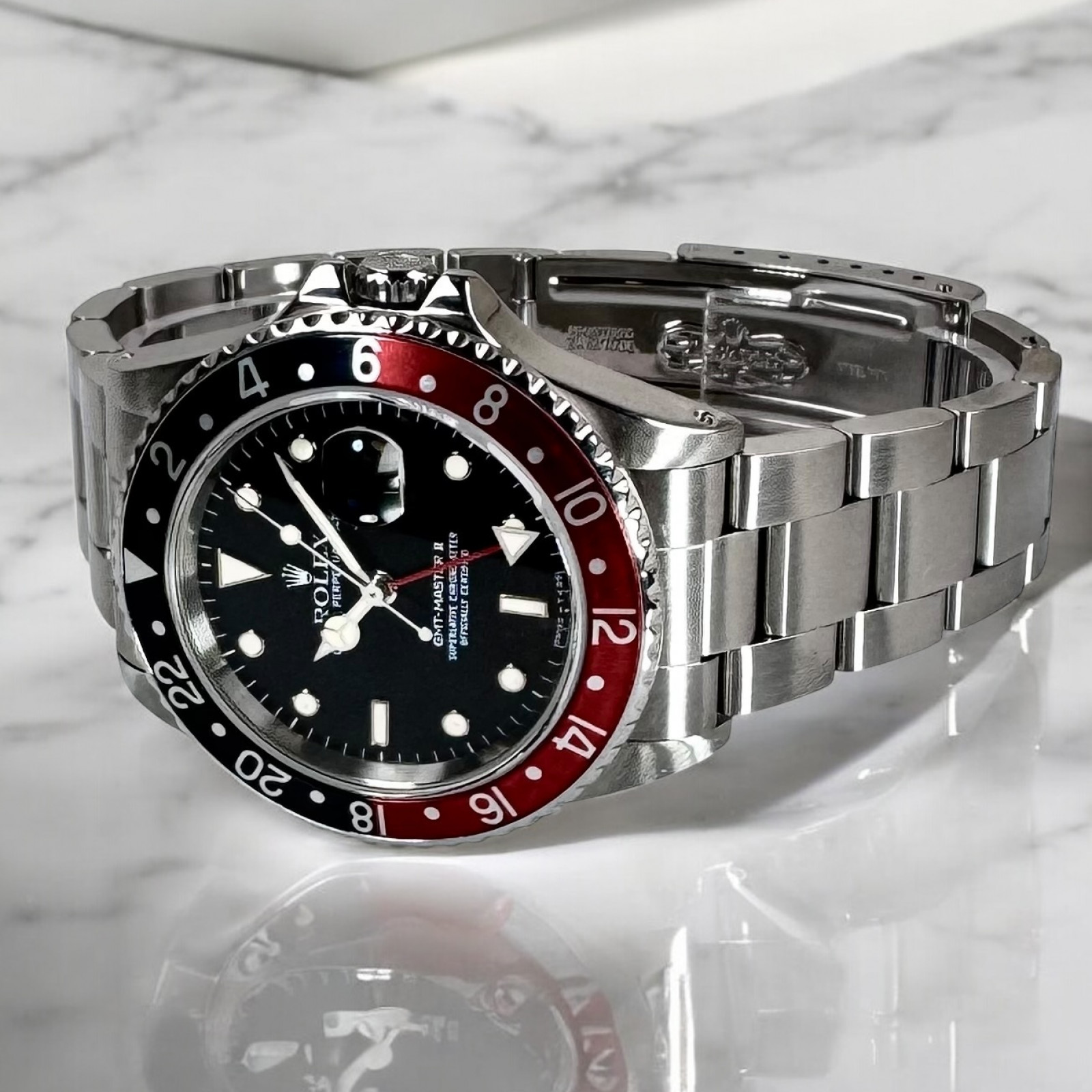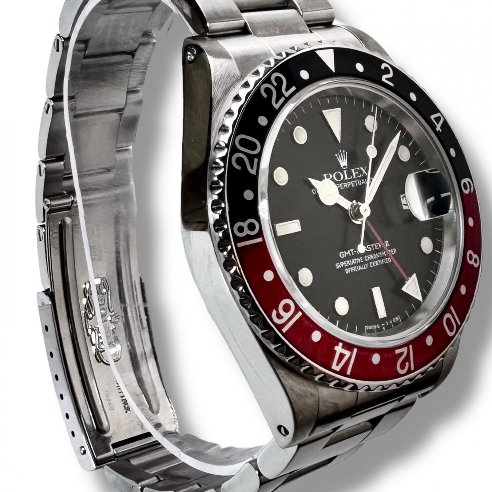 This Rolex GMT II has recently undergone an extensive, comprehensive servicing and reconditioning at the official Rolex factory center. Every component of the watch was meticulously inspected and taken care of to ensure optimal performance. Experienced and skillful technicians carried out the servicing, using state-of-the-art tools specifically designed to handle fine Swiss watches. The technical precision and detail-oriented servicing applied to this prestigious timepiece have succeeded in restoring the watch to a condition virtually indistinguishable from new Rolex watches.