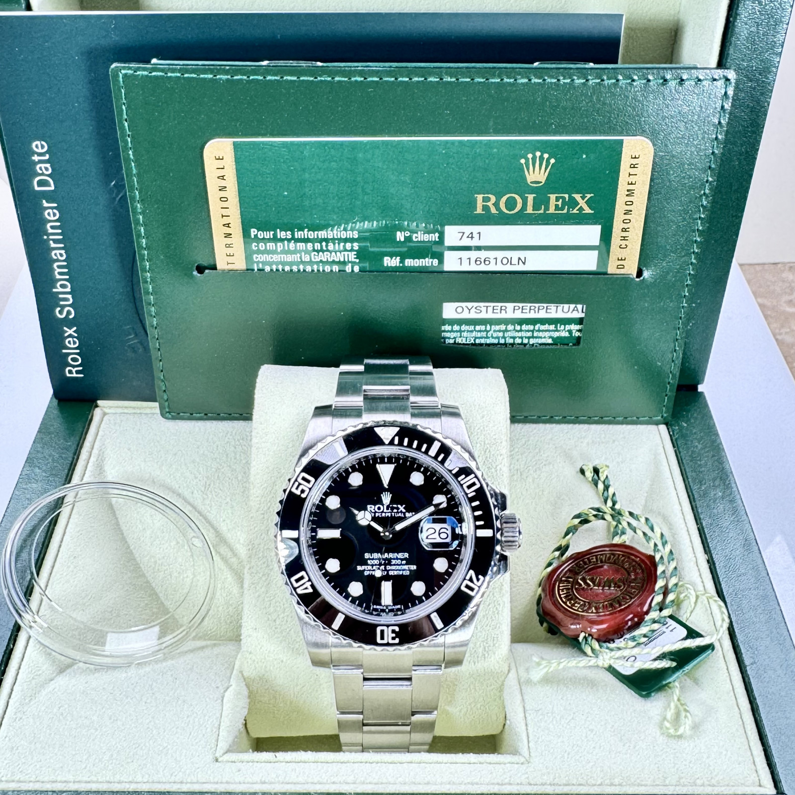 Immerse yourself in the elegance and precision of the Rolex Submariner 116610. This exquisite timepiece, hallmarked with the signature "Rolex" stamp, exemplifies the art and sophistication of fine Swiss watchmaking craftsmanship. The Rolex Submariner 116610, which currently remains in an untouched, unworn condition with all original accessories and stickers intact, has only increased in reverence since its inaugural introduction in 1953.