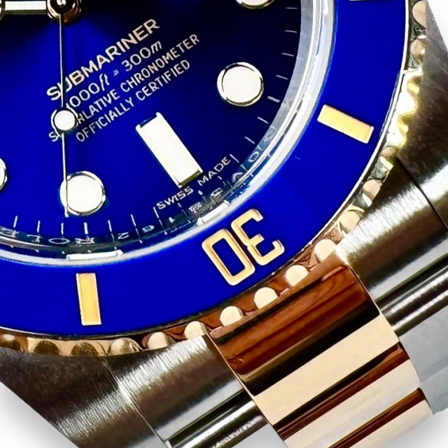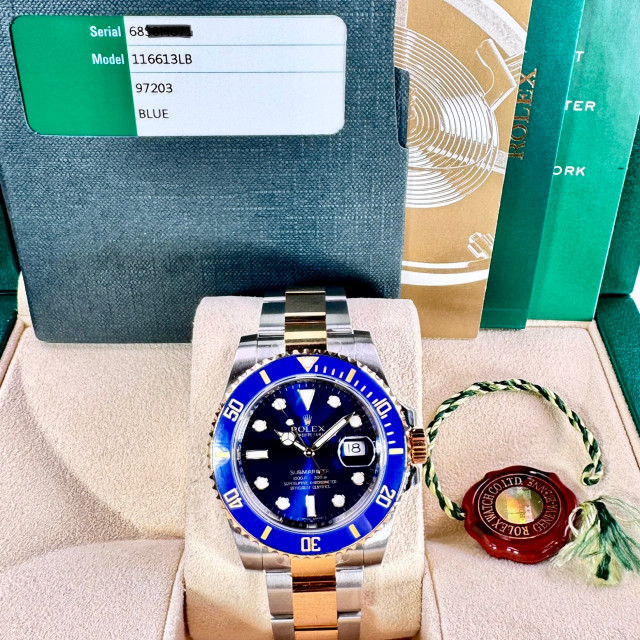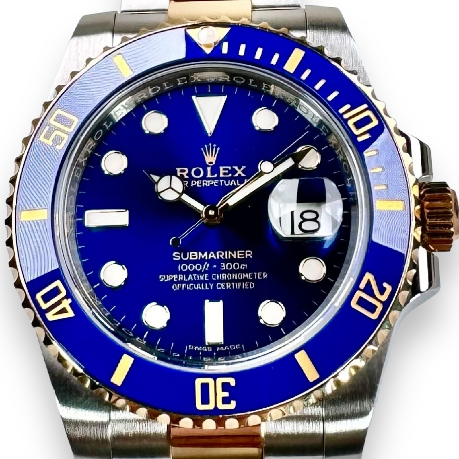 Experience unrivalled opulence and meticulous precision with the Rolex Submarian 116613 model. This is not just a timepiece, but an exceptional, luxury accessory that instantly seizes attention with its alluring deep blue hue. Presented in pristine, mint condition, this watch exemplifies a fusion as ageless as it is lavish - a breathtaking intermixture of 18kt Gold and Stainless Steel, demonstrating the mythical design and outstanding craftsmanship for which Rolex has been globally celebrated for over a century.