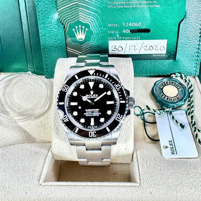 Immerse yourself in a universe of exceptional luxury and pinpoint precision with the highly esteemed Rolex Submariner Non-Date Watch, model number 124060, an extraordinary rarity that sets itself apart with absolute distinction. This watch, in mint condition, epitomizes perfection with its flawless beauty and stands as a poignant testament to the superior craftsmanship that Rolex is renowned for. This timepiece, untouched by the ravages of time, provides a compelling example of an artistry that remains blemish-free despite its journey through years of existence.