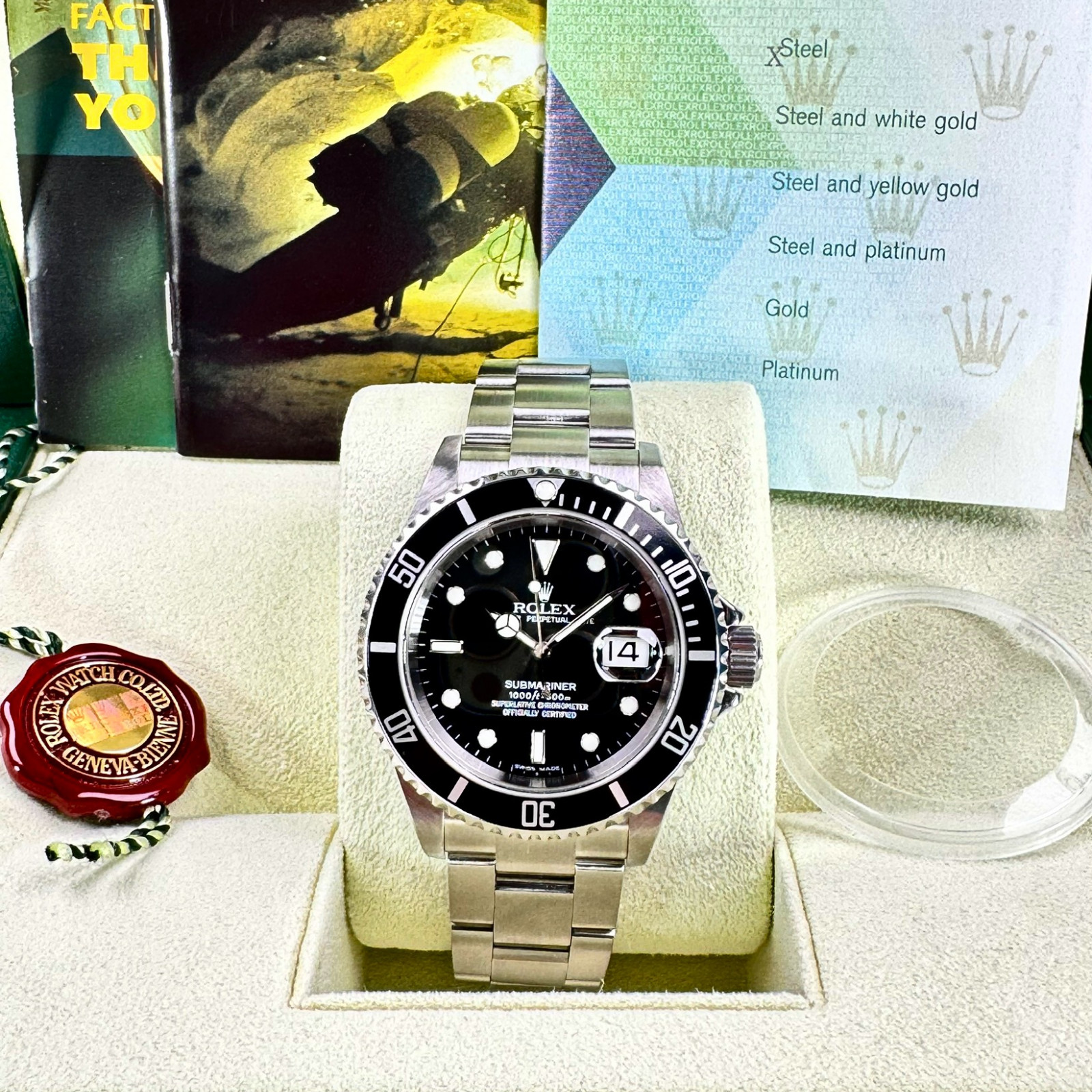 In recognition of its excellent standards, the Rolex Submariner 16610 proudly displays the revered Chronometer certification, awarded by the COSC (Official Swiss Chronometer Testing Institute). This seal of approval provided by the anti-counterfeit division of the Federation of the Swiss Watch Industry reinforces the timepiece's status as a high precision chronometer. This distinction affirms that the watch has successfully undergone stringent testing across numerous positions and varying temperatures to ensure authentic quality to prospective owners.