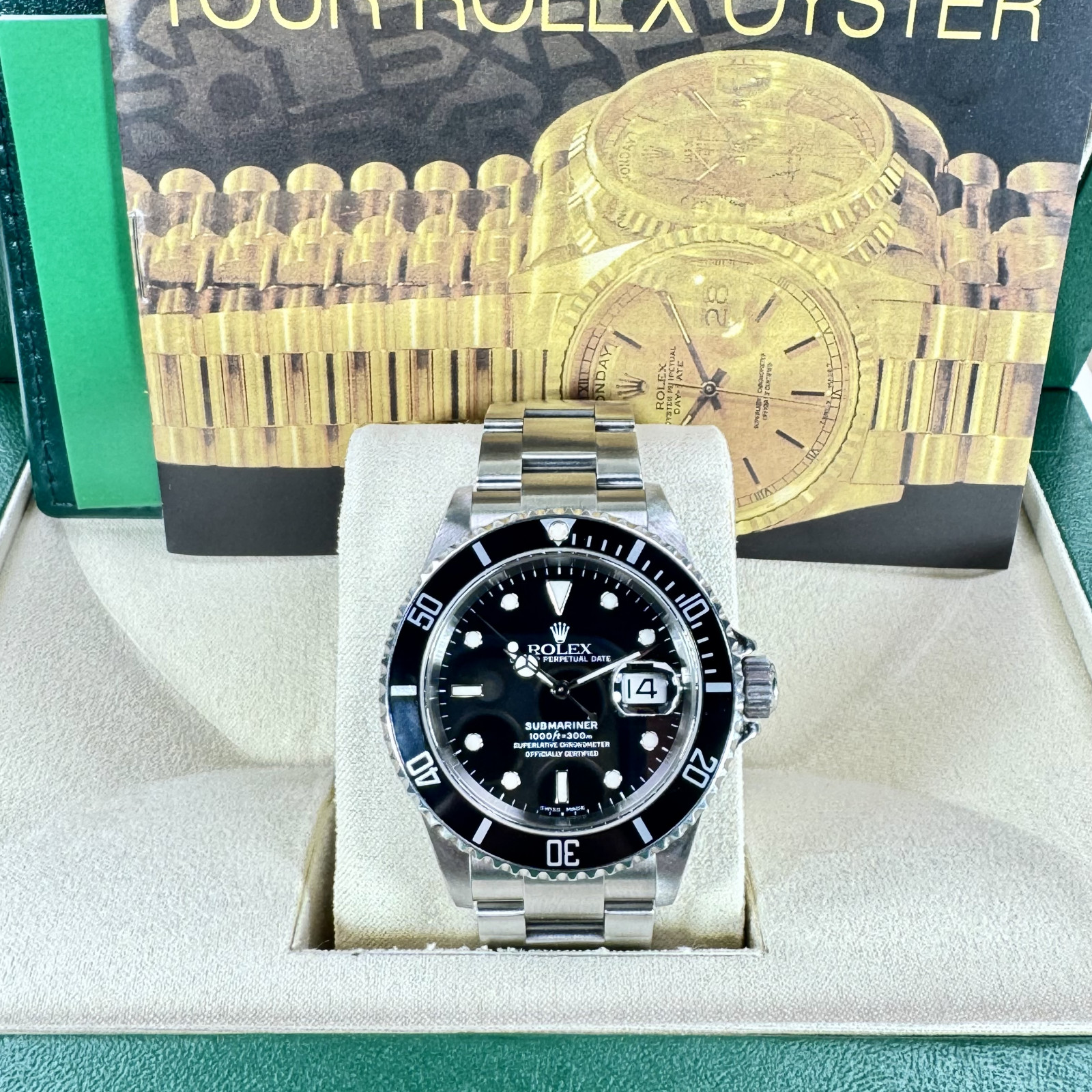 One indication of the Rolex Submariner 16610's unparalleled standards is the revered Chronometer certification conferred by the COSC (Official Swiss Chronometer Testing Institute). This seal of approval, assigned by the anti-counterfeit arm of the Federation of the Swiss Watch Industry, endorses the watch's status as a high-precision chronometer. It guarantees that the timepiece has successfully passed rigorous testing under multiple positions and varying temperatures, ensuring nothing short of authentic quality for potential owners.