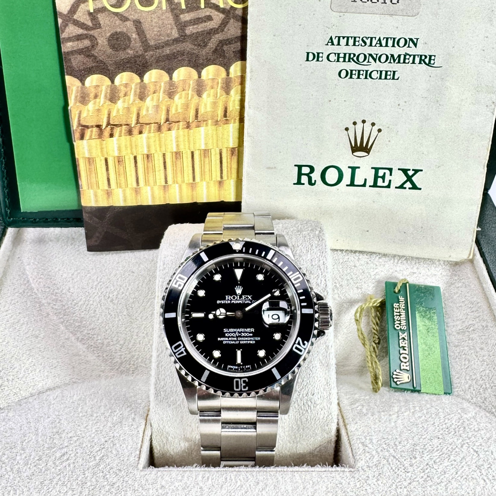 Introducing the iconic and majestic Rolex Submarianer 16610, a superior, elite-class timepiece that remains untouched and in an pristine condition. It brilliantly embodies the meticulous craftsmanship and the fine attention to detail that Rolex is globally acclaimed for. This exceptional timepiece first graced the horological world in 1953, quickly captivating both professional divers and chronometer enthusiasts alike. Owing to its striking appearance and exceptional performance, it quickly spurred to become a favourite and unrivalled choice within its category. The striking popularity of this timepiece knows no limits - it has even been proudly worn by the quintessential, sly and savvy cinematic personality, James Bond. This speaks volumes of its undeniable aesthetic appeal and high functionality.
