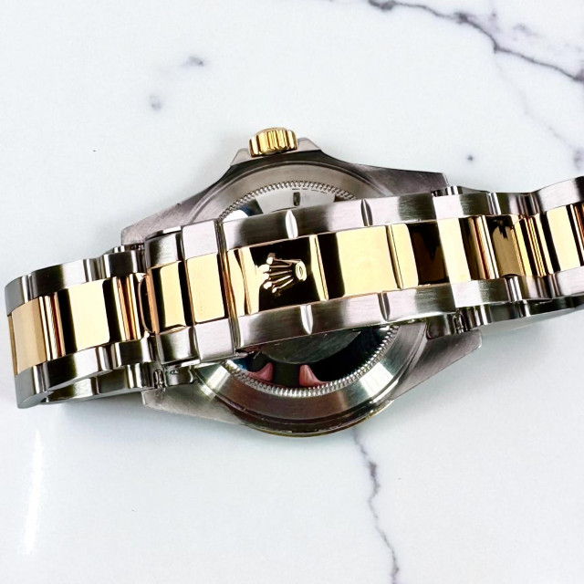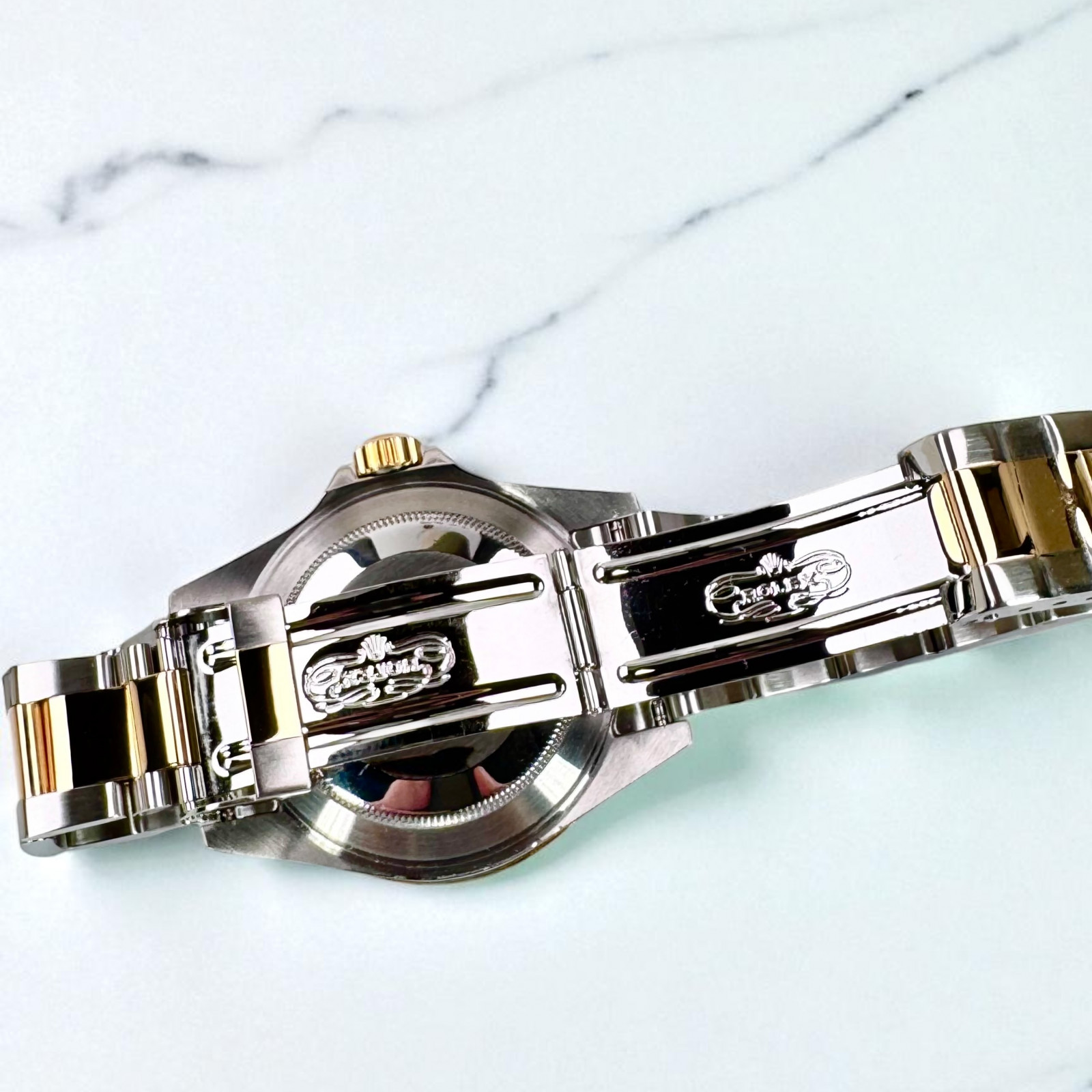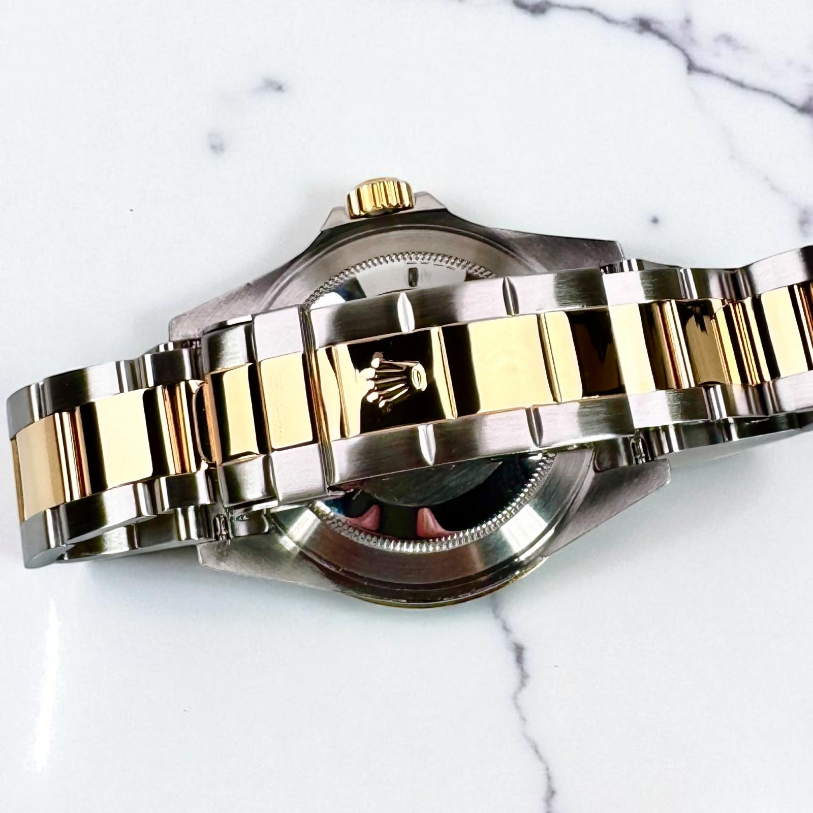Adding to its opulent allure is the perfect match of an exquisite 18kt gold and stainless steel Oyster bracelet. This iconic accouterment harmonizes beautifully with the blue dial, combining to create a luxurious synergy that is nothing short of hypnotic.