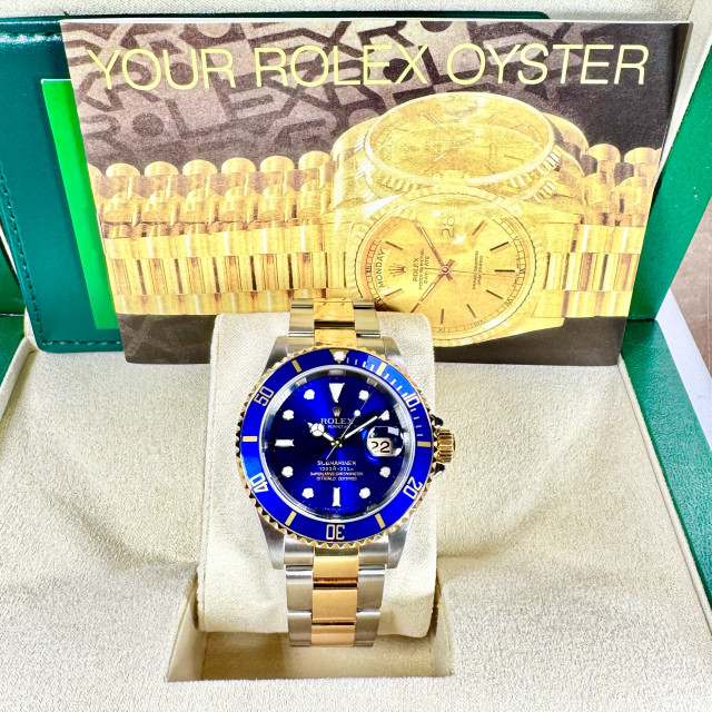 For all its cherished and much-lauded status, this regal timepiece has only been worn sparingly on select special occasions, thus preserving its impeccable, untarnished initial appearance. The Rolex Submariner 16613 manifests the brand's inimitable practice of artfully blending luxurious materials such as resplendent 18KT Gold and hard-wearing Stainless Steel. These materials have been smoothly intertwined, uniting timeless elegance with staunch durability - a beautiful amalgamation that true horologists praise and the premium wristwatch marketplace flourishes on.