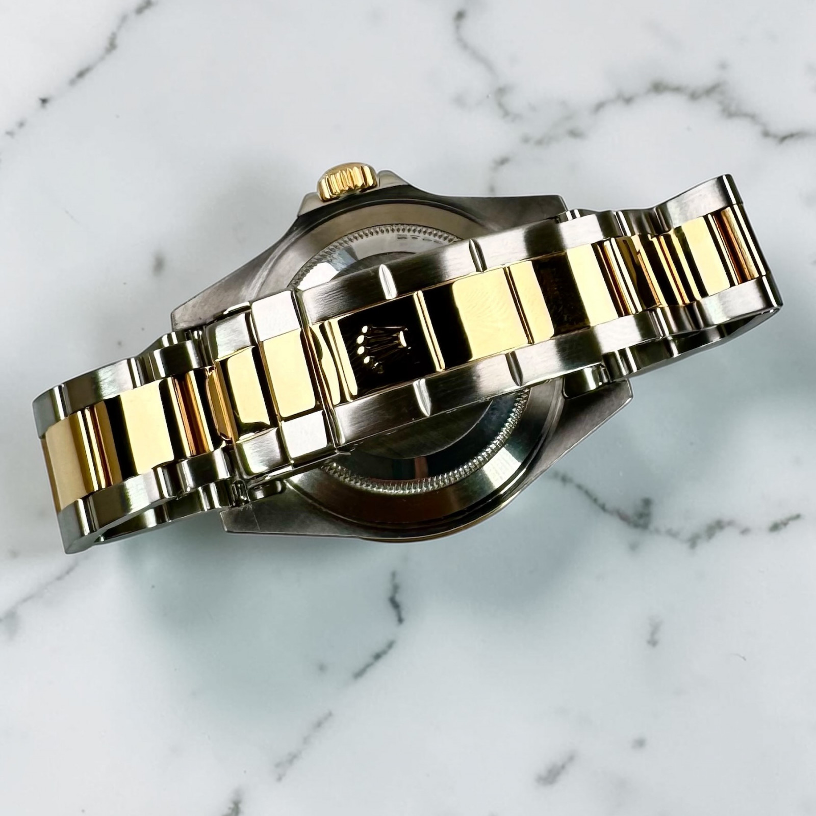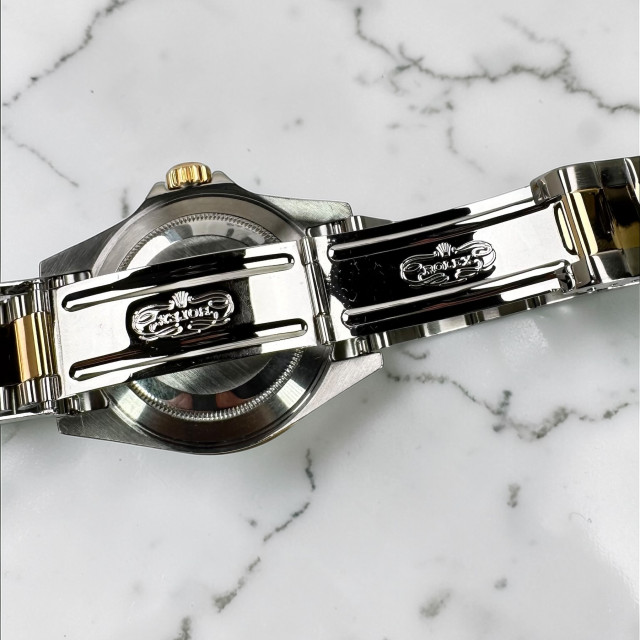 The Submariner's allure is further accentuated by the 18 KT gold rotating bezel, infusing an opulent touch to this esteemed diver's watch. The masterful intersection of gold and stainless steel is a shining testament to the brilliant craftsmanship and unrelenting attention to minute details by Rolex, culminating in an elegant union of practicality and luxury.