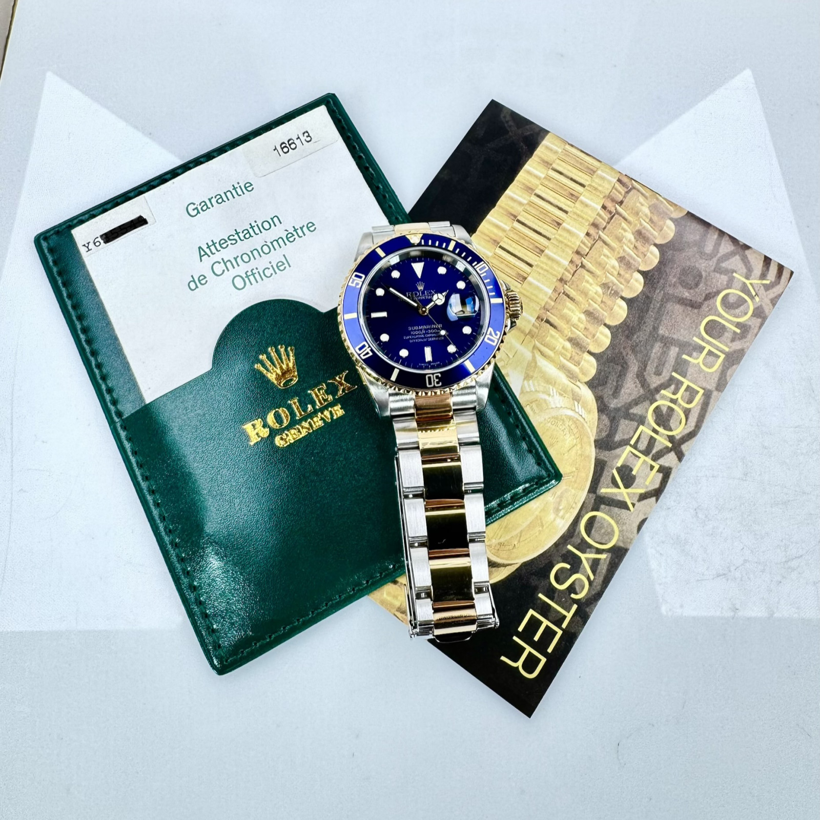We are delighted to unveil the breathtaking Rolex Submarianer 16613, a majestic timepiece that encapsulates both prestige and unrivalled excellence. This shining example of horological perfection remains in flawless, mint condition, illuminating the commendable care and maintenance bestowed upon it by its preceding custodians. Deftly crafted with an unerring precision in 2003, this fine timepiece stands as an awe-inspiring witness to the unwavering commitment of Rolex towards intricate craftsmanship, selection of high-grade materials, and leveraging cutting-edge technology to pioneer watchmaking advances.
