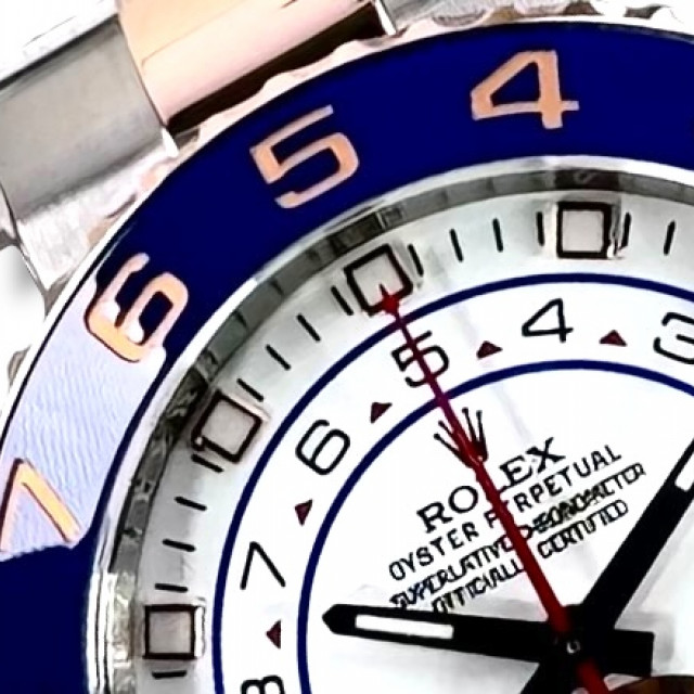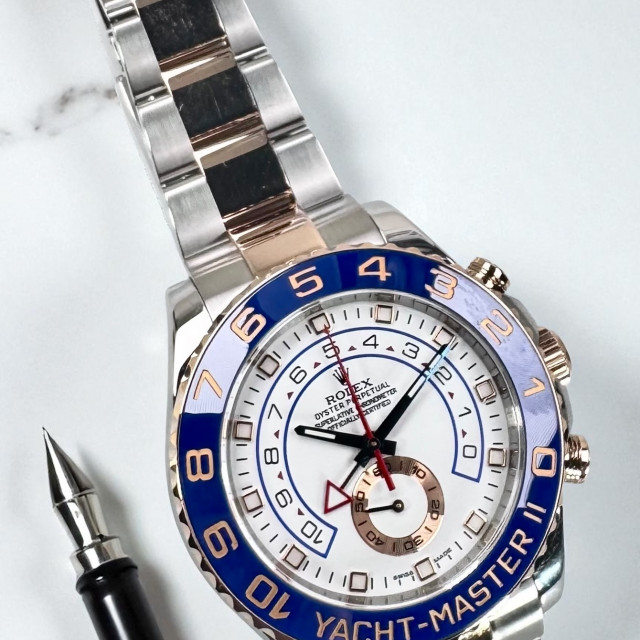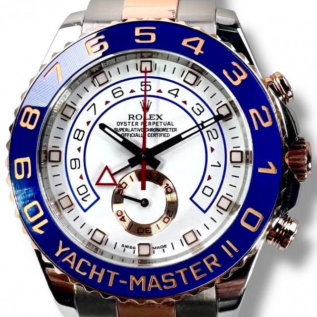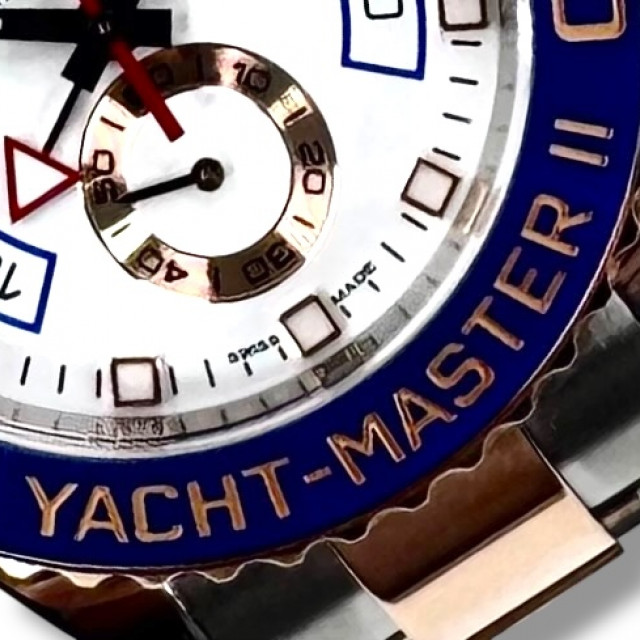 This timekeeper holds the Superlative Chronometer certification, which is a combination of the COSC (Controle Officiel Suisse des Chronometres) and a battery of tests conducted by Rolex after casing. This dual certification emphasizes Rolex's dedication to high standards of watch-making, ensuring optimal performance and unparalleled precision of this Yacht-Master II.