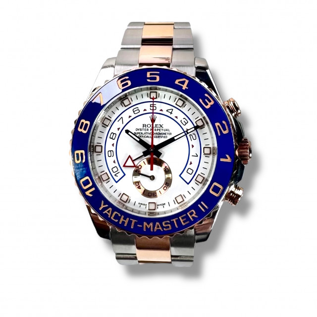 One of the most distinctive features of this Yacht-Master II is its rotating blue ring command bezel. This innovative feature, exclusive to Rolex, allows the wearer to set the watch's countdown function for their sailing start time. Simply breathtaking, this bezel also serves as a stunning contrast to the rose gold and steel exterior of the watch.