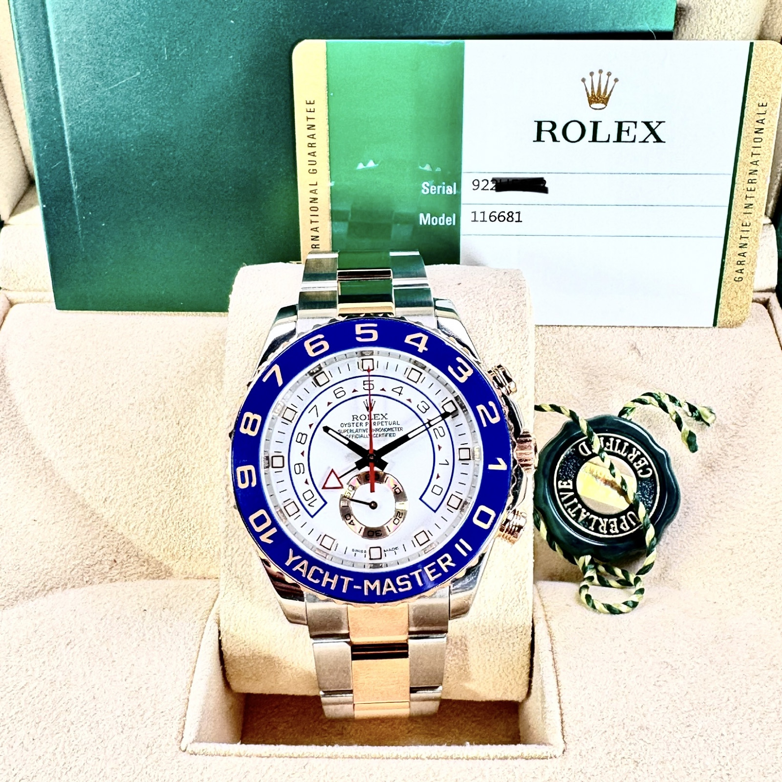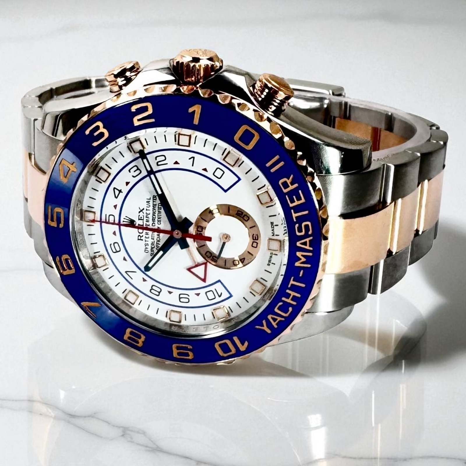 Add grandeur to your wrist with this exquisite Rose Gold & Steel Oyster Rolex Yacht-Master II 116681. With an imposing 44mm case, it makes an unforgettable statement. Meticulously produced in 2016, this timepiece stands tall in mint condition, unblemished and flawlessly preserved.