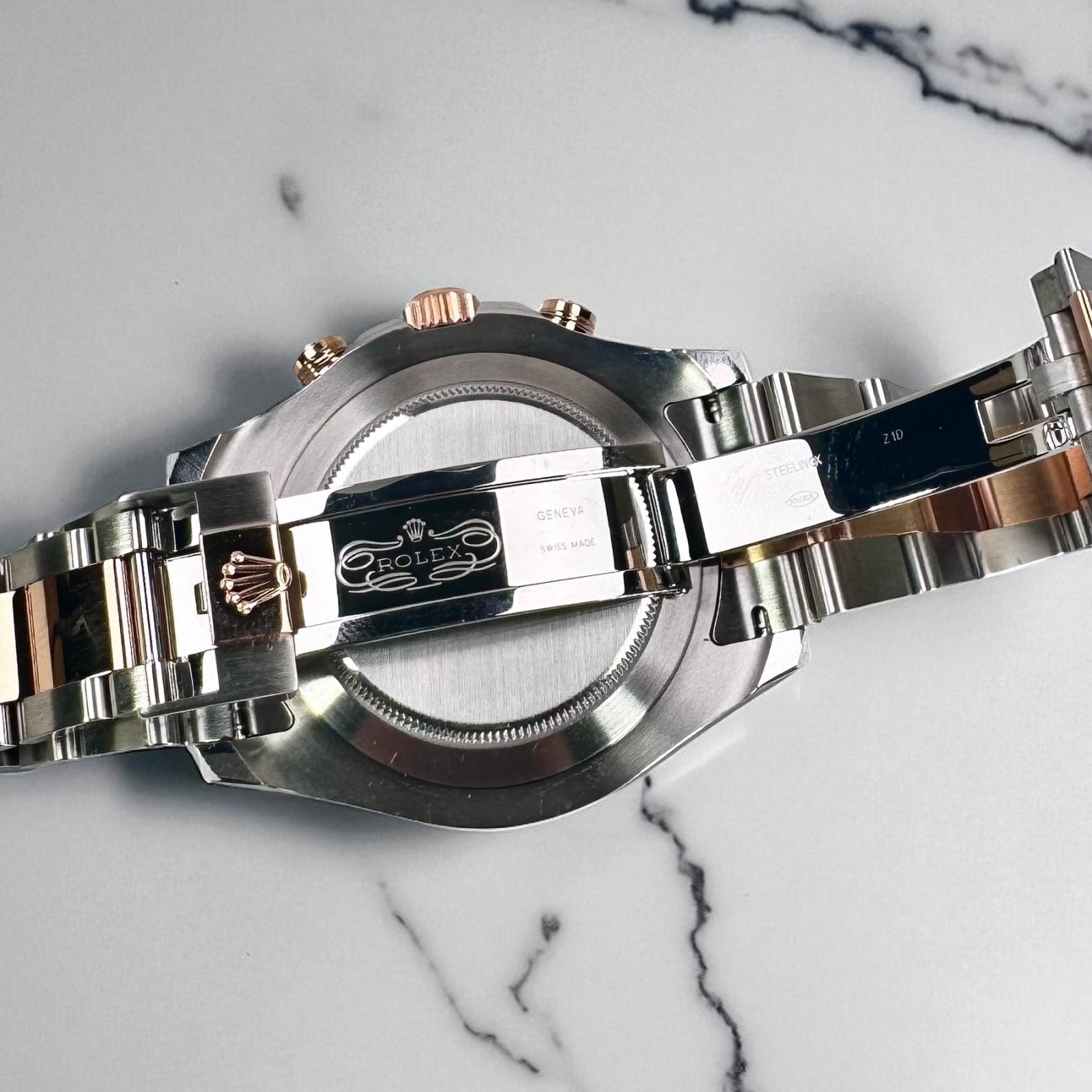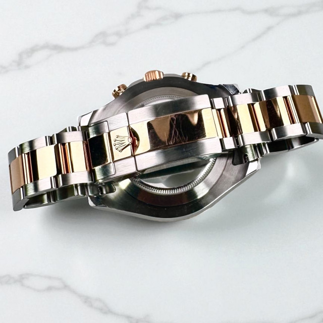 Its 18KT Rose Gold & Stainless Steel Oyster bracelet gracefully circles the wrist, offering supreme comfort alongside unabashed glamour. The flip-lock clasp and easylink adjustment system offer convenient customization of the bracelet length, without needing any special tools.